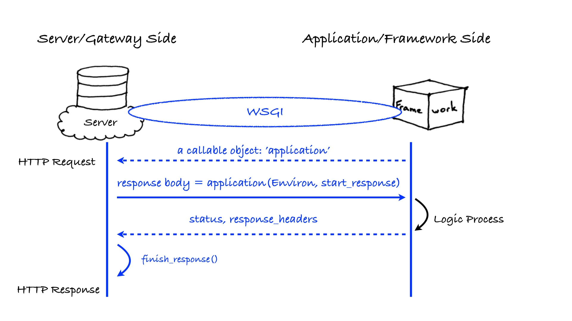 接着 WSGI 接口必须将 environ 交给应用程序去处理,这里 WSGI 规定应用程序提供一个可调用对象 application,然后服务器去调用 application,获得返回值为HTTP响应正文。服务器在调用 application 的时候,需要提供两个变量,一个是前面提到的变量字典environ,另一个是可调用对象 start_response,它产生状态码和响应头,这样我们就得到了一个完整的HTTP响应。Web 服务器将响应返回给客户端,一次完整的HTTP请求-响应过程就完成了。