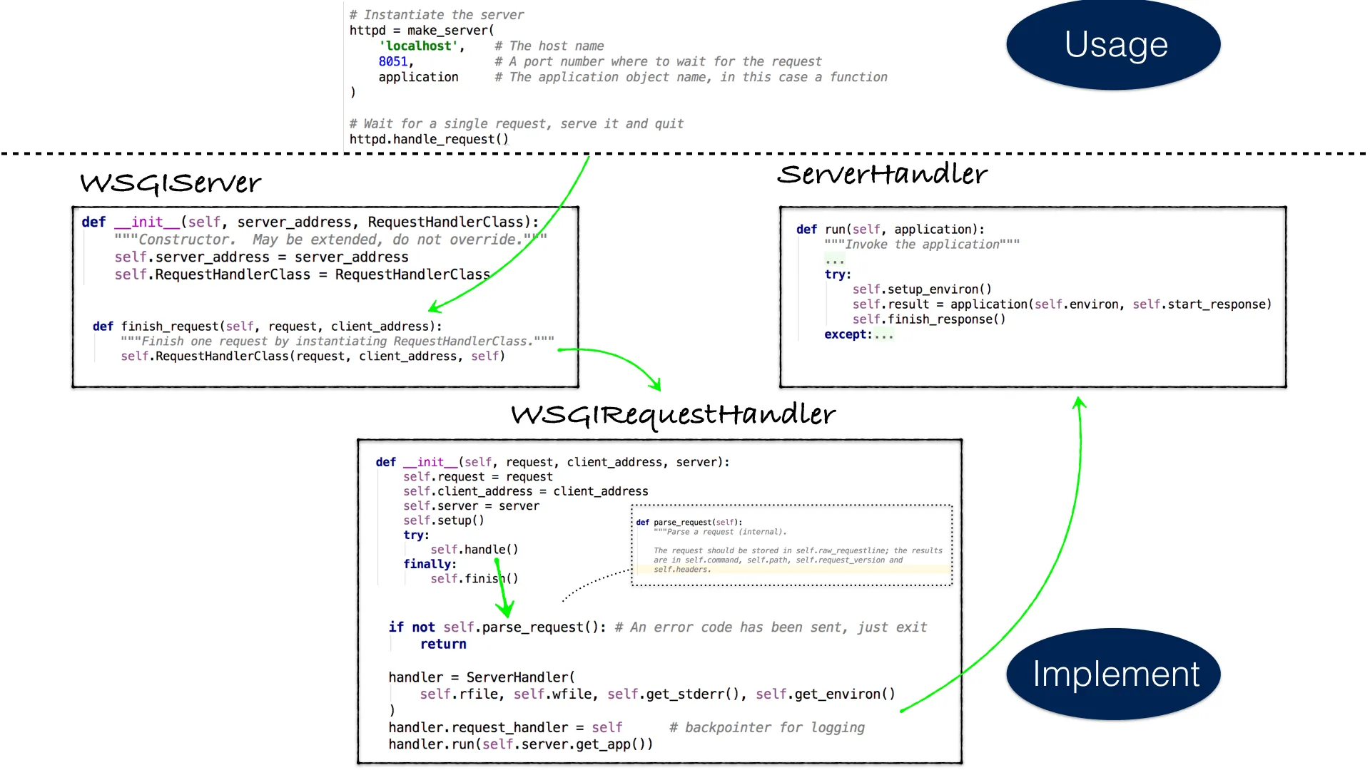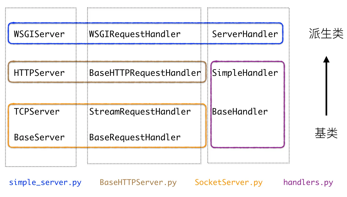 其中 TCPServer 使用 socket 来完成 TCP 通信,HTTPServer 则是用来做 HTTP 层面的处理。同样的,StreamRequestHandler 来处理 stream socket,BaseHTTPRequestHandler 则是用来处理 HTTP 层面的内容,这部分和 WSGI 接口关系不大,更多的是 Web 服务器的具体实现,可以忽略。