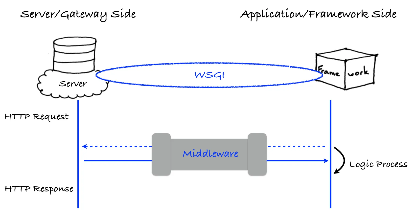 Python 社区当然也需要这样一套 API,来适配Web服务器和应用程序,这套 API 就是 WSGI(Python Web Server Gateway Interface),在 PEP 3333 里有详细的说明。简单来说,WSGI是连接Web服务器和Web应用程序的桥梁,一方面从Web server 拿到原始 HTTP 数据,处理成统一格式后交给 Web 应用程序,另一方面从应用程序/框架这边进行业务逻辑处理,生成响应内容后交给服务器。