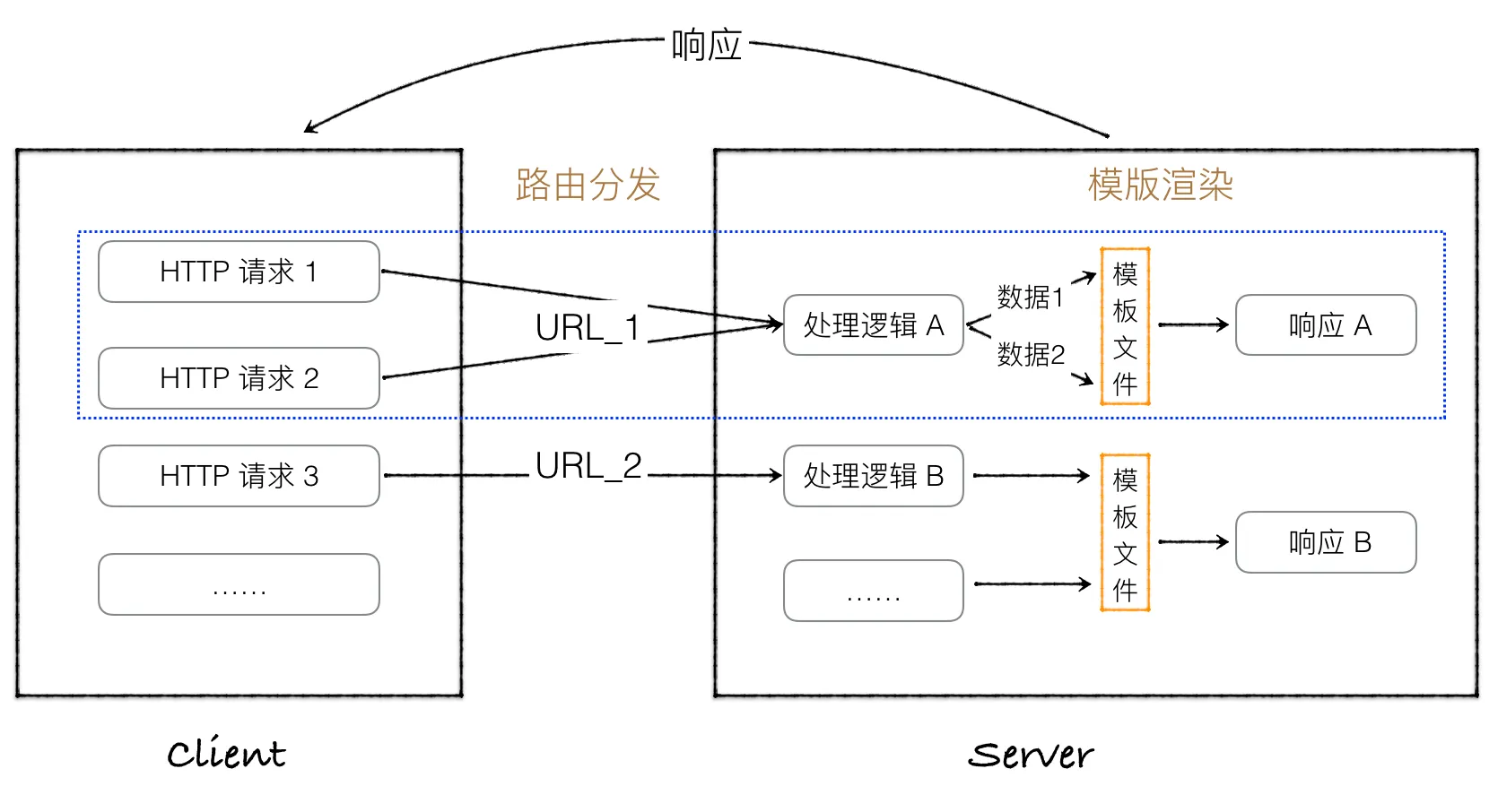 一种比较常见的场景是,请求虽然不同,但响应中数据的展示方式是相同的。仍以论坛为例,对不同topic而言,其具体topic content虽然不同,但页面展示的方式是一样的,都有标题拦,内容栏等。也就是说,对于 topic 来说,我们只需提供一个HTML模板,然后传入不同topic数据,即得到不同的HTTP响应。这就是所谓的模板渲染,如下图所示: