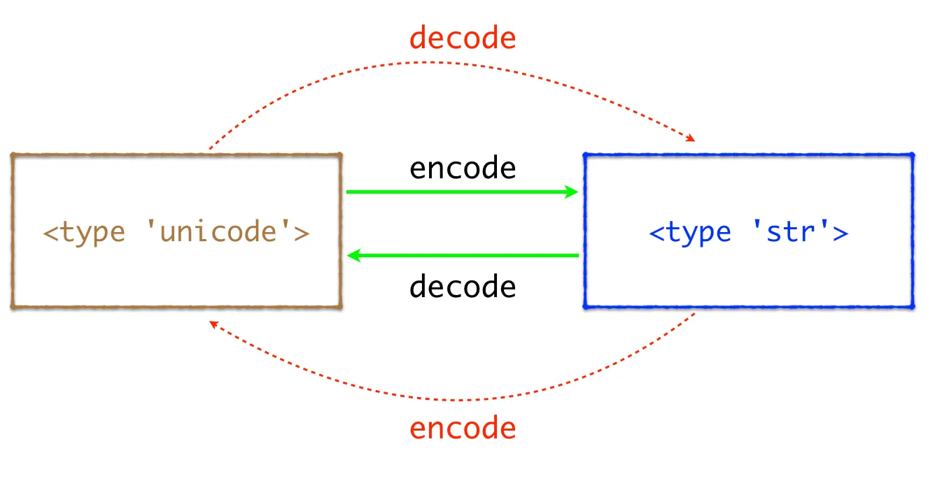 翻译成人话就是,unicode 有点类似于前面 Alice 打招呼传递的想法,而 str 则是写下来的文字(或者是说出来的声音,甚至可以是手语)。我们可以用 GBK,UTF-8 等编码方案将 Unicode 类型转换为 str 类型,类似于用语言、文字或者手语来表达想法。