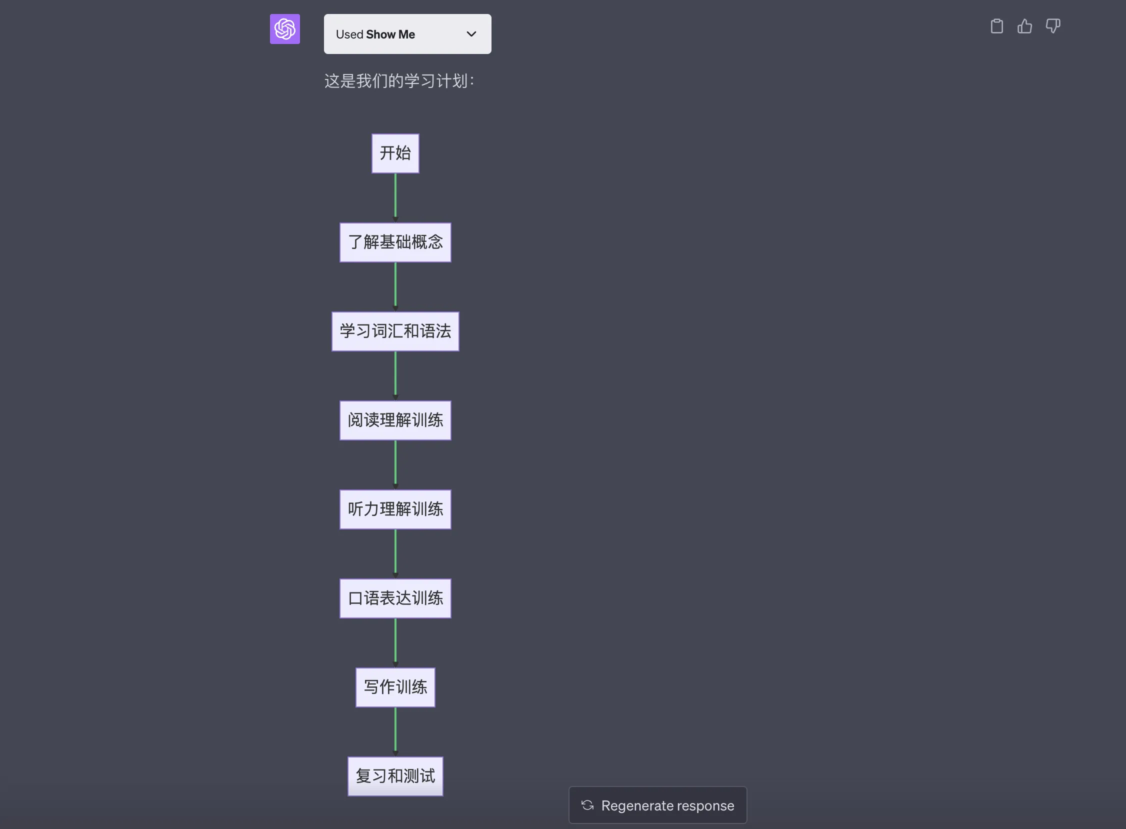 这里用了 GPT4 的 ShowMe 插件,可以画图,直接给出了学习路线图;