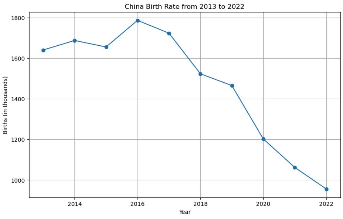 接下来,我将在 notebook 中添加一些 Python 代码来创建出生人口的曲线走势图。这是从2013年到2022年中国出生人口的曲线走势图: