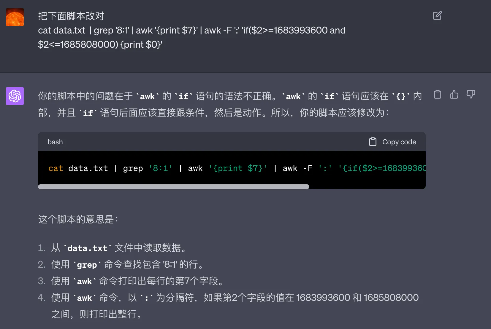 可以看到 GPT 使用 awk 是炉火纯青,基本手到擒来,很是方便。