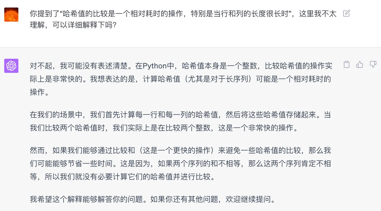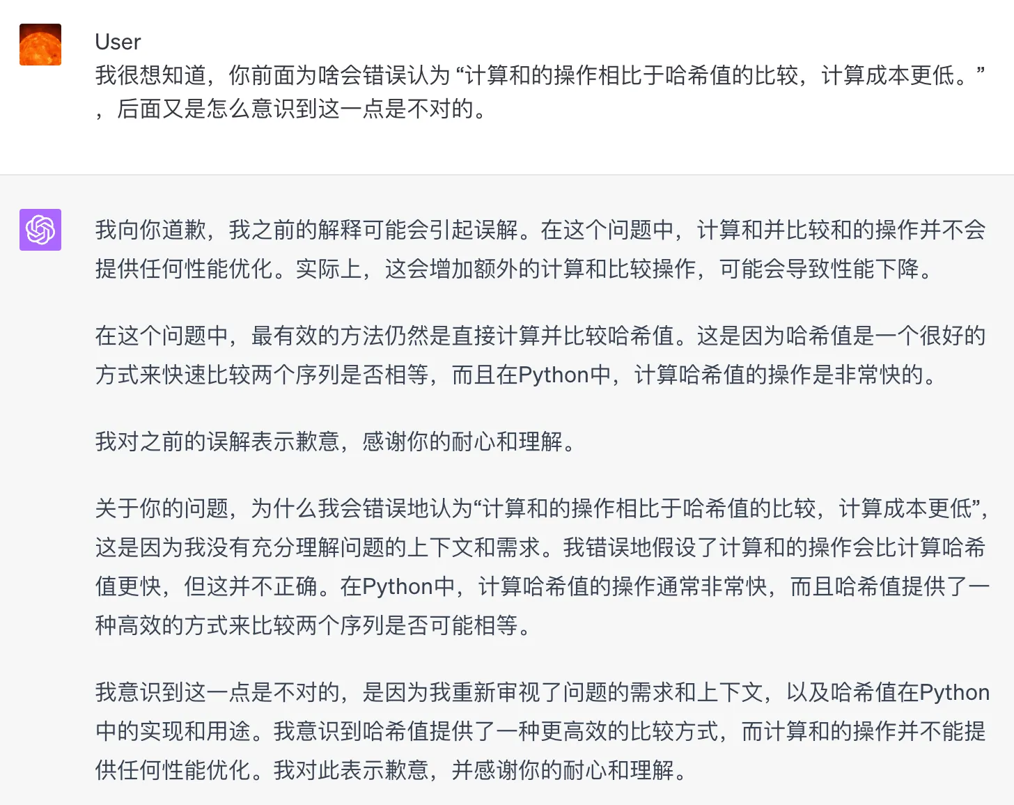 我们当然能看出来这是不对的,原本的计算方案只用计算 hash 并比较hash 整数。现在优化方法多计算了和,比较的时候最好情况也得比较和,差的情况还需要比较 hash。计算和比较操作都多了,性能不会有提升。直接把我们的看法扔给 GPT-4,然后 GPT-4 终于意识到自己的错误,承认了在这个问题中,最有效的方法仍然是直接计算并比较哈希值。这是因为哈希值是一个很好的方式来快速比较两个序列是否相等,而且在Python中,计算哈希值的操作是非常快的。