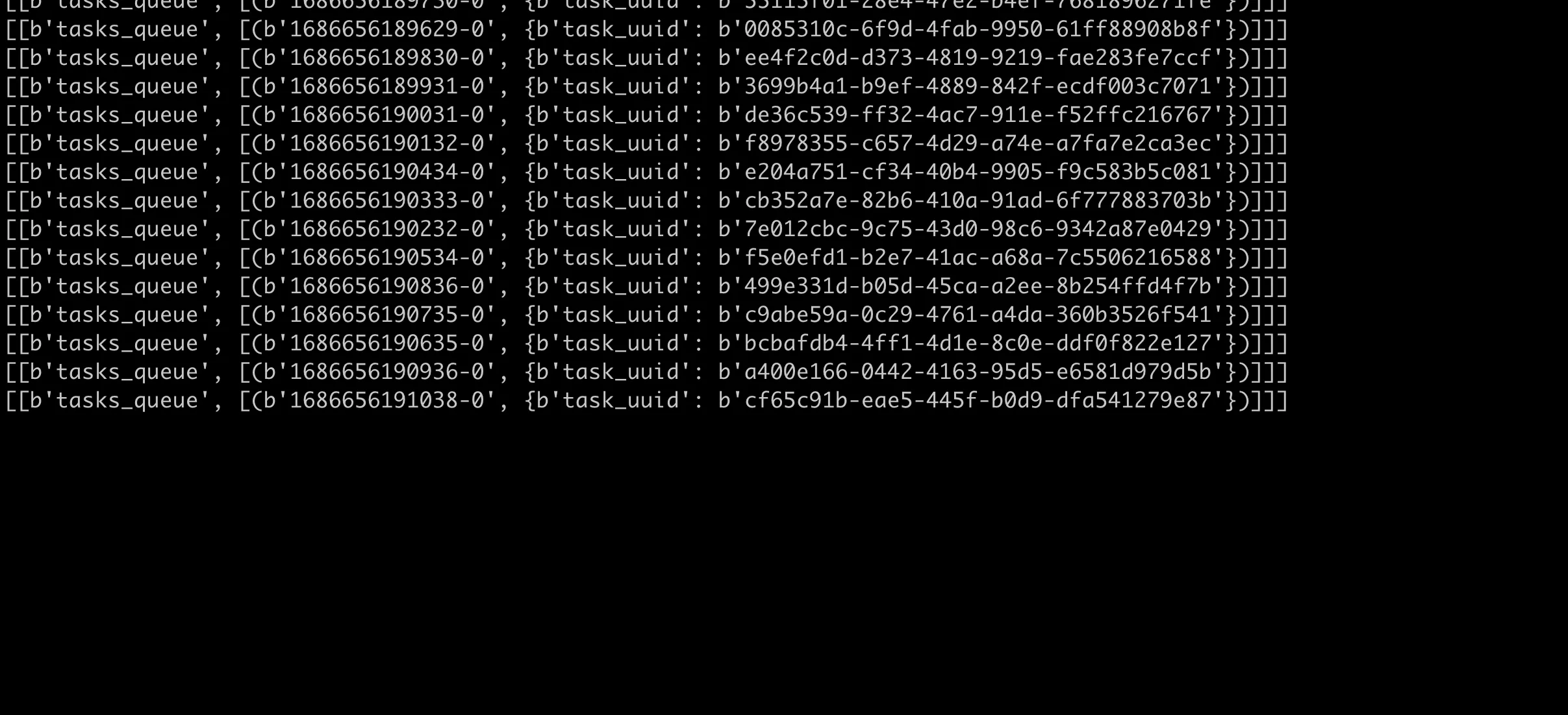 - subscriber.py:这个脚本创建了一组订阅者,每个订阅者都尝试创建一个名为 ‘test’ 的任务队列,并持续从该队列中读取新的流。如果没有新的流,订阅者会暂停 5 秒钟,然后继续尝试读取。如果读取到新的流,订阅者会打印出新的流。这个脚本会持续运行,直到所有的订阅者进程都结束。