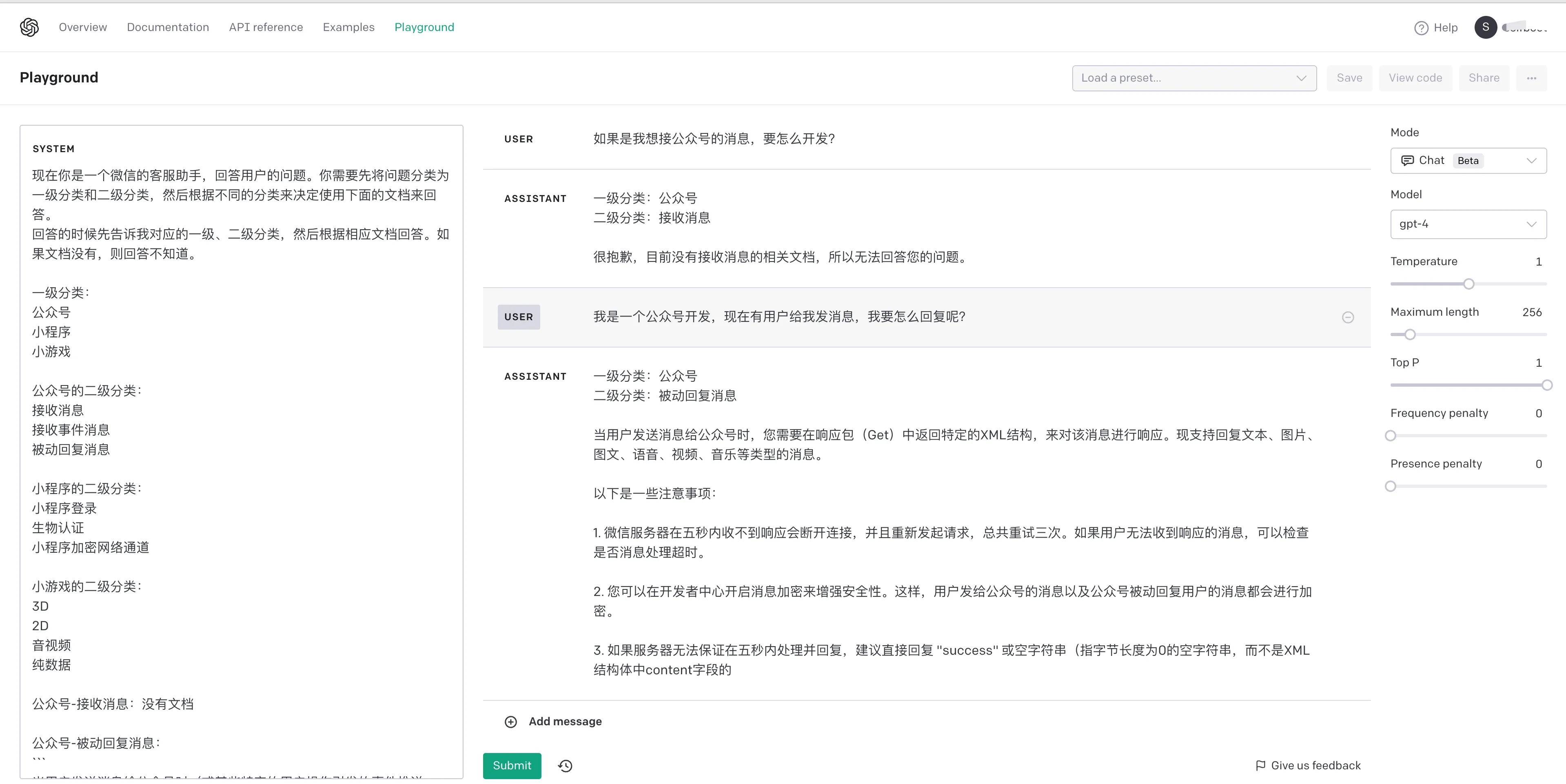 上面在 OpenAI playground 上创建了一个简单示例,通过让 GPT4 先对问题分类,然后再根据不同类型的子问题和引用文本,来生成答案。注意这里示例把整个内容放到 system msg,实际构建客服的时候,第一步只用让 GPT4 分类,然后根据分类信息,来选择文档作为引用文本,重新提问。