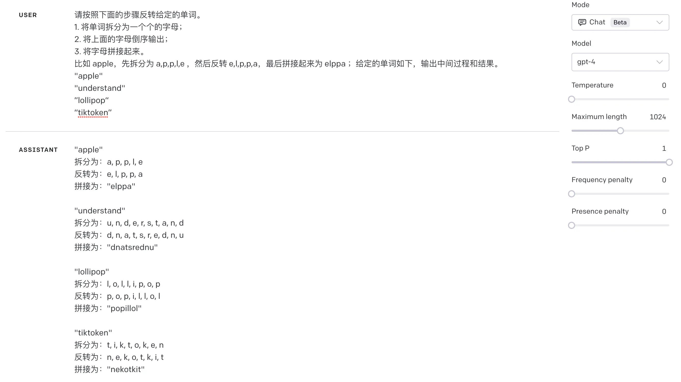 有些任务看起来很简单,似乎不用拆分子任务就能完成。比如反转一个英语单词,给你 apple,输出 elppa;给你 lollipop,输出popillol。如果让 gpt-4 直接来翻转单词,可能会得到错误的结果。