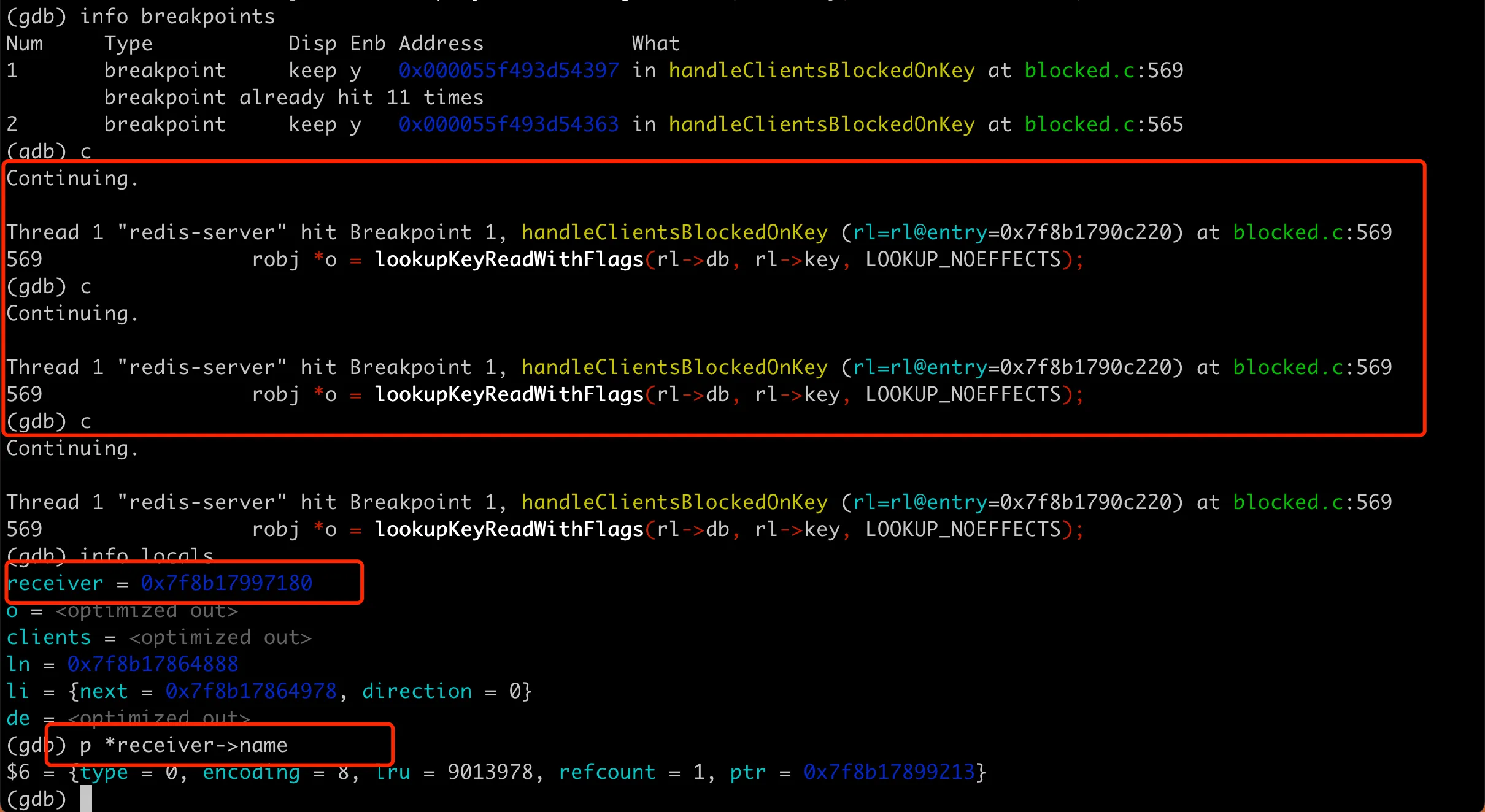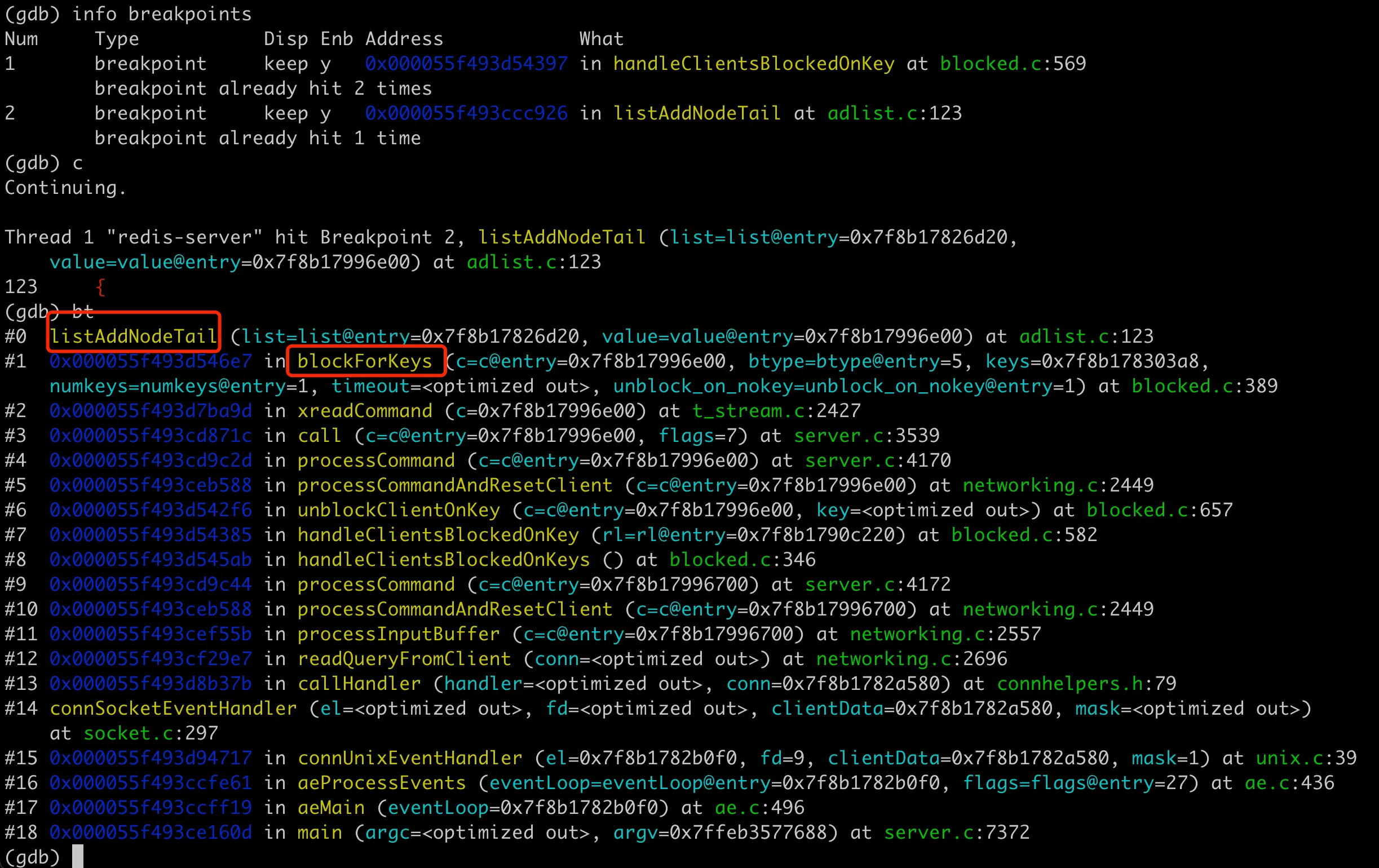 考虑到 Redis server 进程还在,我们可以用 GDB attach 到进程上,打断点看下具体的执行过程。在火焰图上看到的比较耗时的 handleClientsBlockedOnKey 函数里面有 while 循环语句。而 CPU 飙满的话一般都是死循环,为了验证是不是有死循环在这个 while 里,可以在 whil 前面的 565 行和里面的 569 行打上断点,然后 continue 多次进行观察。