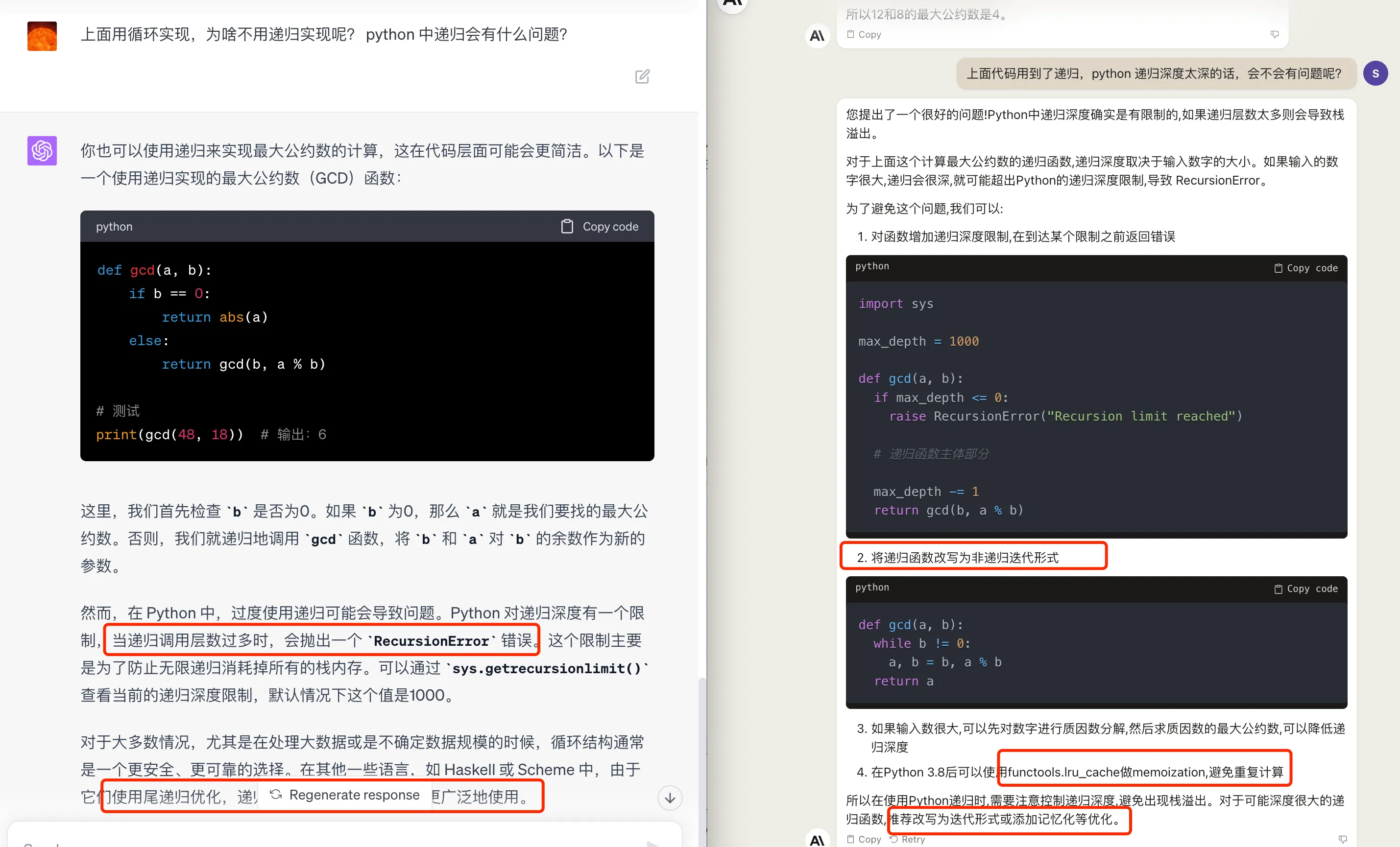 Claude2 也知道 Python 递归深度限制,给出了循环版本的实现。另外,还提到在 Python 3.8 之后,可以使用functools.lru_cache 做memoization,避免重复计算。其实在最大公约数这里,添加记忆话效果并不是很好,这里的建议不是很合理。