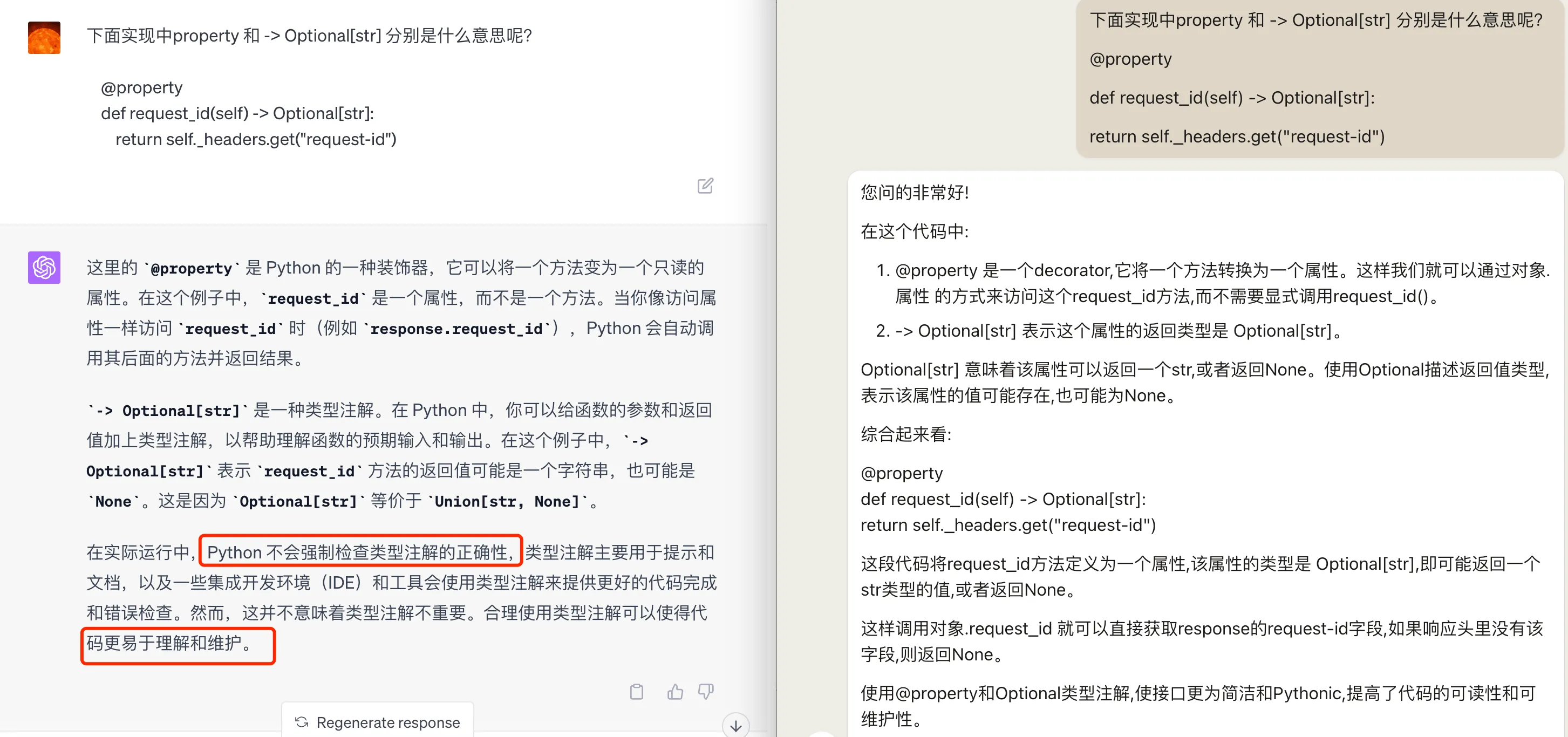 接着再详细问一些 Python 语法相关的知识点,@property 和 -> Optional[str] 分别是什么意思。两个模型都回答对了,不过 GPT4 的回答明显会更加详细,并且有一定的扩展。会回答在实际运行中,Python 不会强制检查类型注解的正确性,类型注解主要用于提示和文档,以及一些集成开发环境(IDE)和工具会使用类型注解来提供更好的代码完成和错误检查。