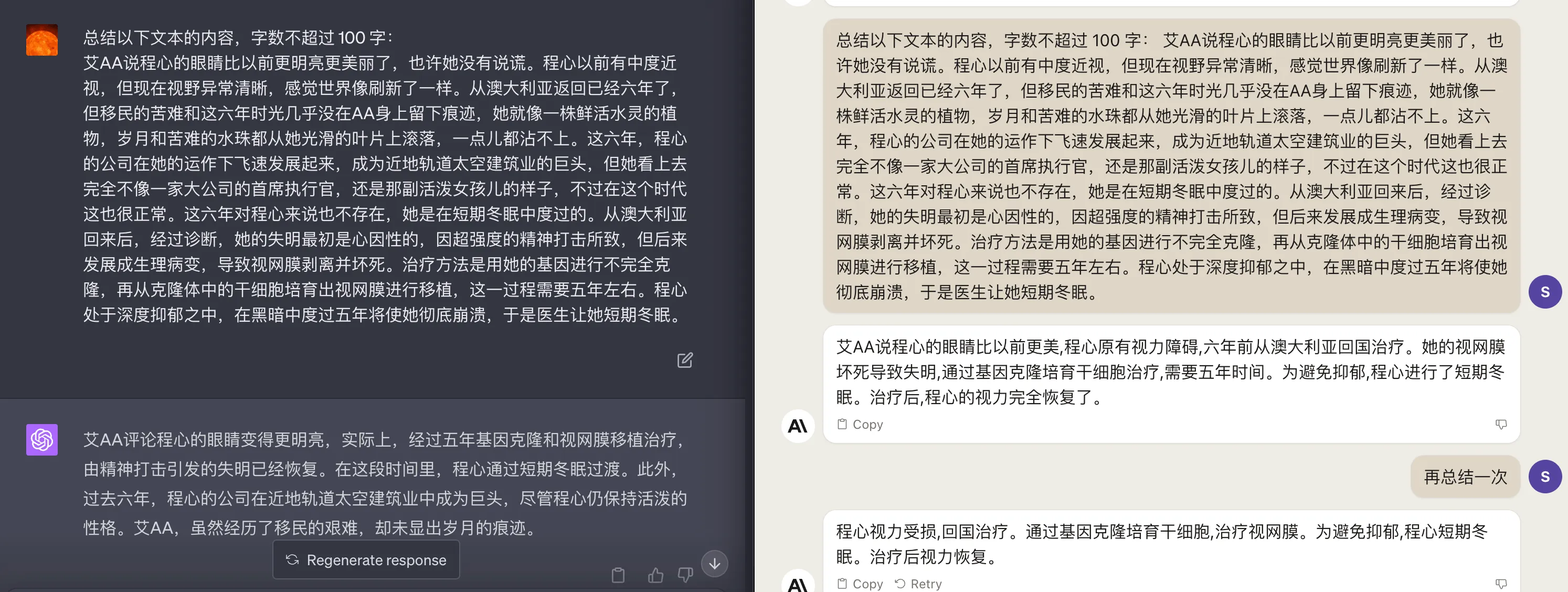 GPT4也可以再简短一点,生成如下:程心经过五年基因克隆和视网膜移植治疗,恢复了视力,同时她的公司在近地轨道太空建筑业中崭露头角,而艾AA虽经历移民艰难,但未显岁月痕迹。总体看两个模型能力基本一样,没有明显优劣。