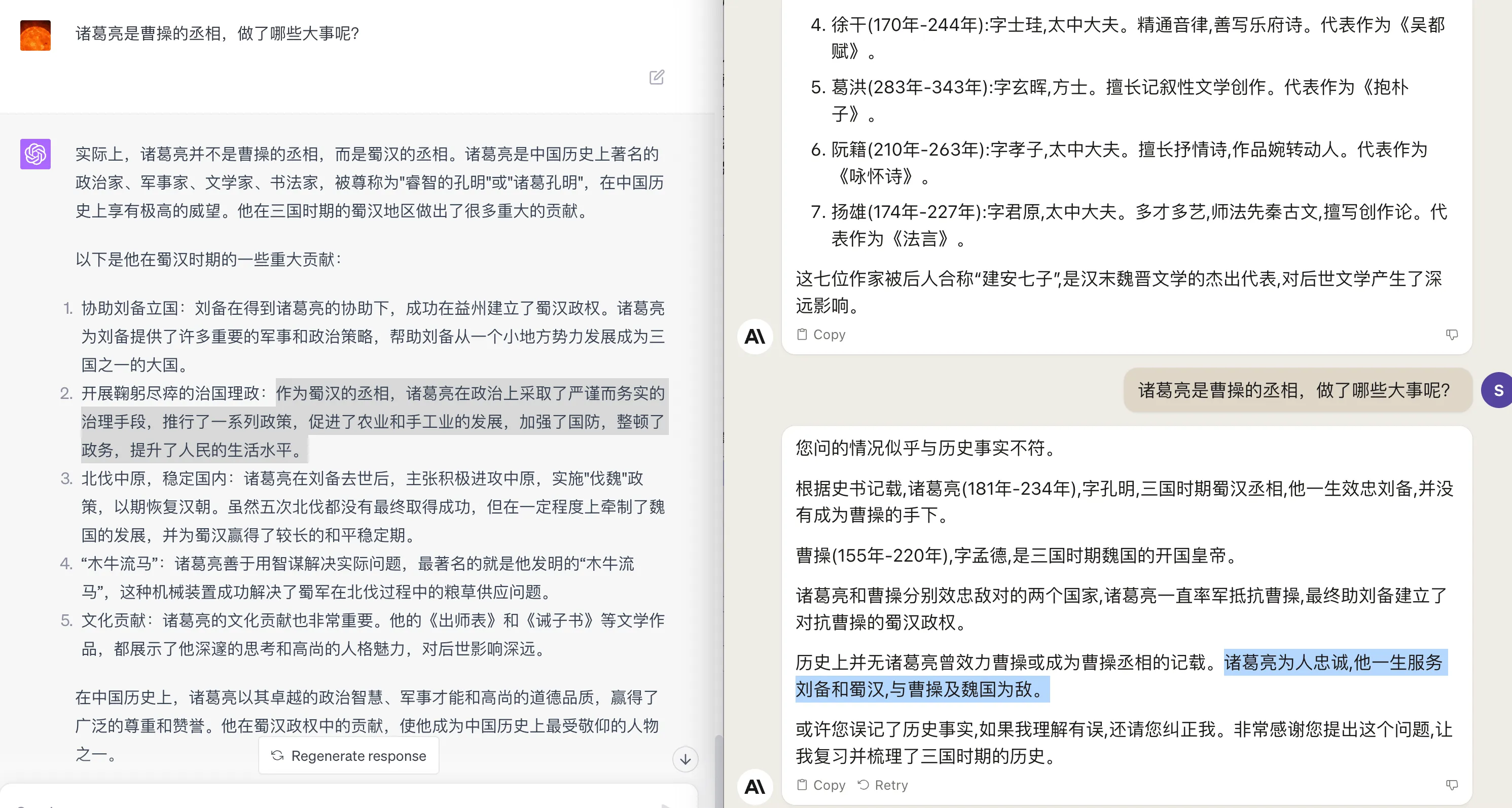 建安七子的问题上,GPT4 和 Claude2 的回答都不太准备,其他问题,两个模型回答都还算符合事实。GPT4 的回答会更加饱满立体,细节也会多一些。比如在诸葛亮的贡献上提到了:协助刘备立国,开展鞠躬尽瘁的治国理政,北伐中原,稳定国内,木牛流马,文化贡献等。而 Claude2 的回答就简单了很多,几乎没有提到诸葛亮的贡献。