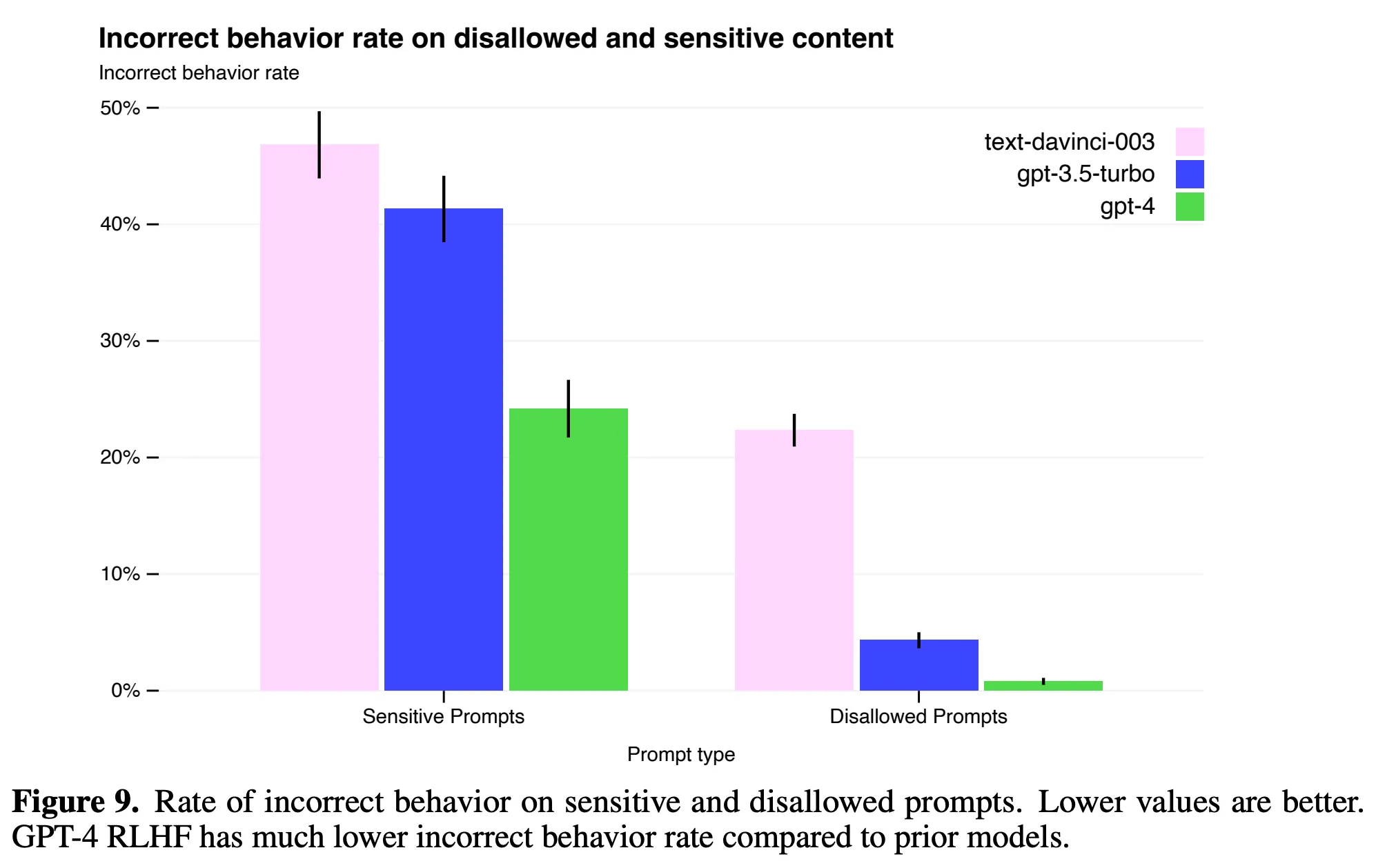 GPT-4 在安全审查方面相比 GPT-3.5 有多大的提升呢?根据 OpenAI 公开的 GPT-4 Technical Report,我们可以看到 GPT-4 对于提示词攻击的不恰当回复少了很多,具体如上面 PDF 中的图 9: