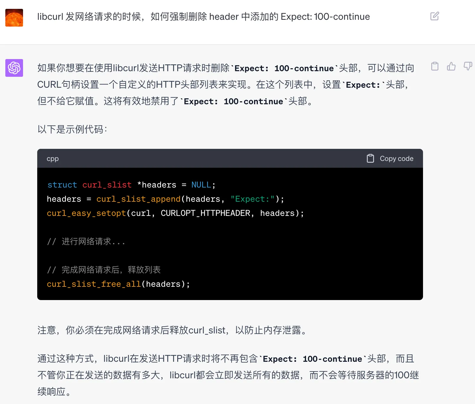 Mesh 层的代码由专人维护,在提交 Issue 后难以确定何时能修复,而业务上又迫切需要解决该问题。于是就只好改 libcurl 的调用方法,在请求的时候去掉这个请求头。问了下 ChatGPT,用 libcurl 发送网络请求时,如何去掉这个 header,得到下面的方法。