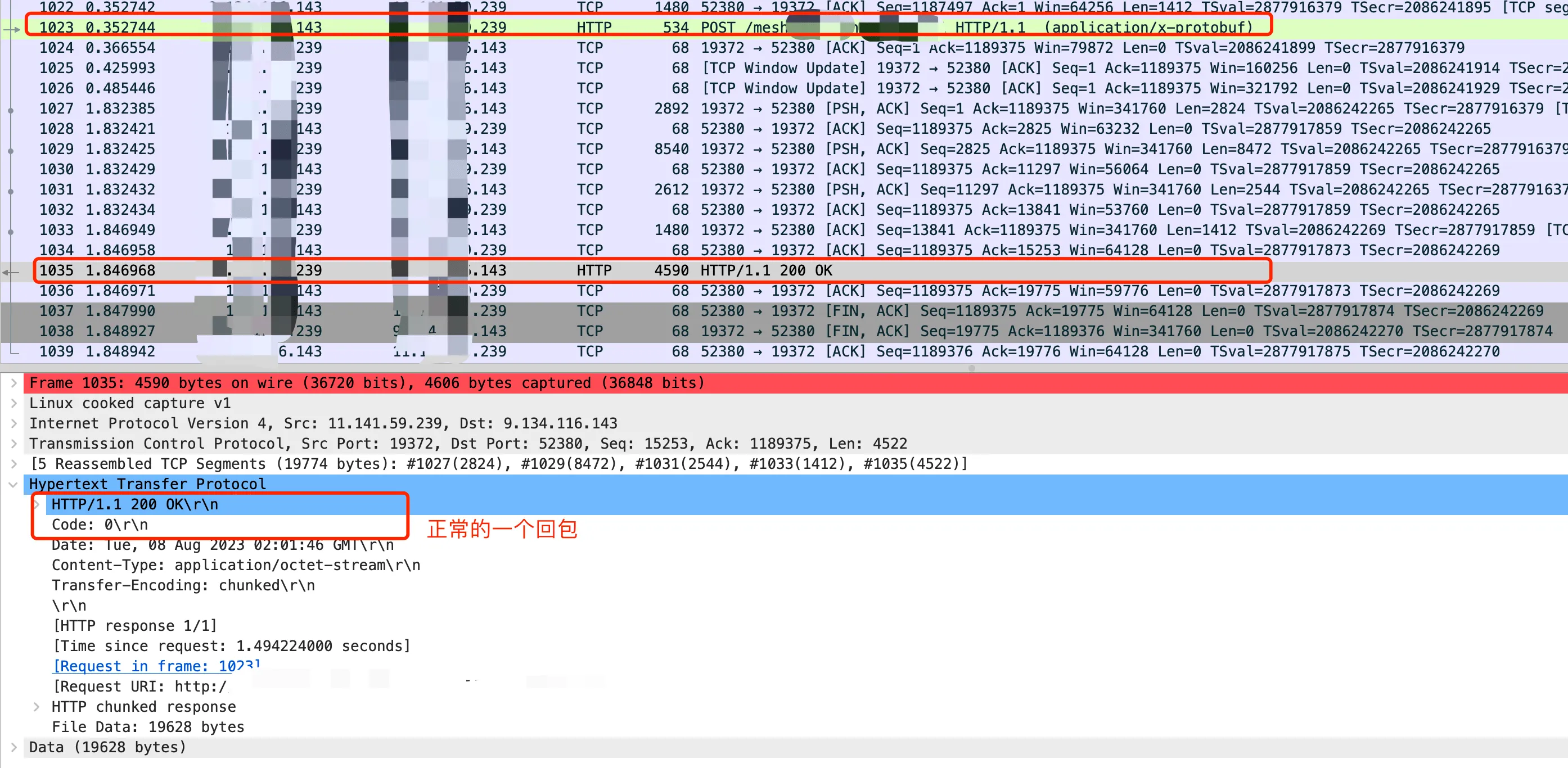 首先抓 go client(IP 最后是143) 和 Go Server B(IP最后是239) 的包,整个请求响应是完全符合预期的,可以看到 0.35 s 左右请求 TCP 发送完毕,然后在 1.8s 左右开始接收回包。HTTP 请求耗时 1.5s 左右,回包内容也是完全正确的。