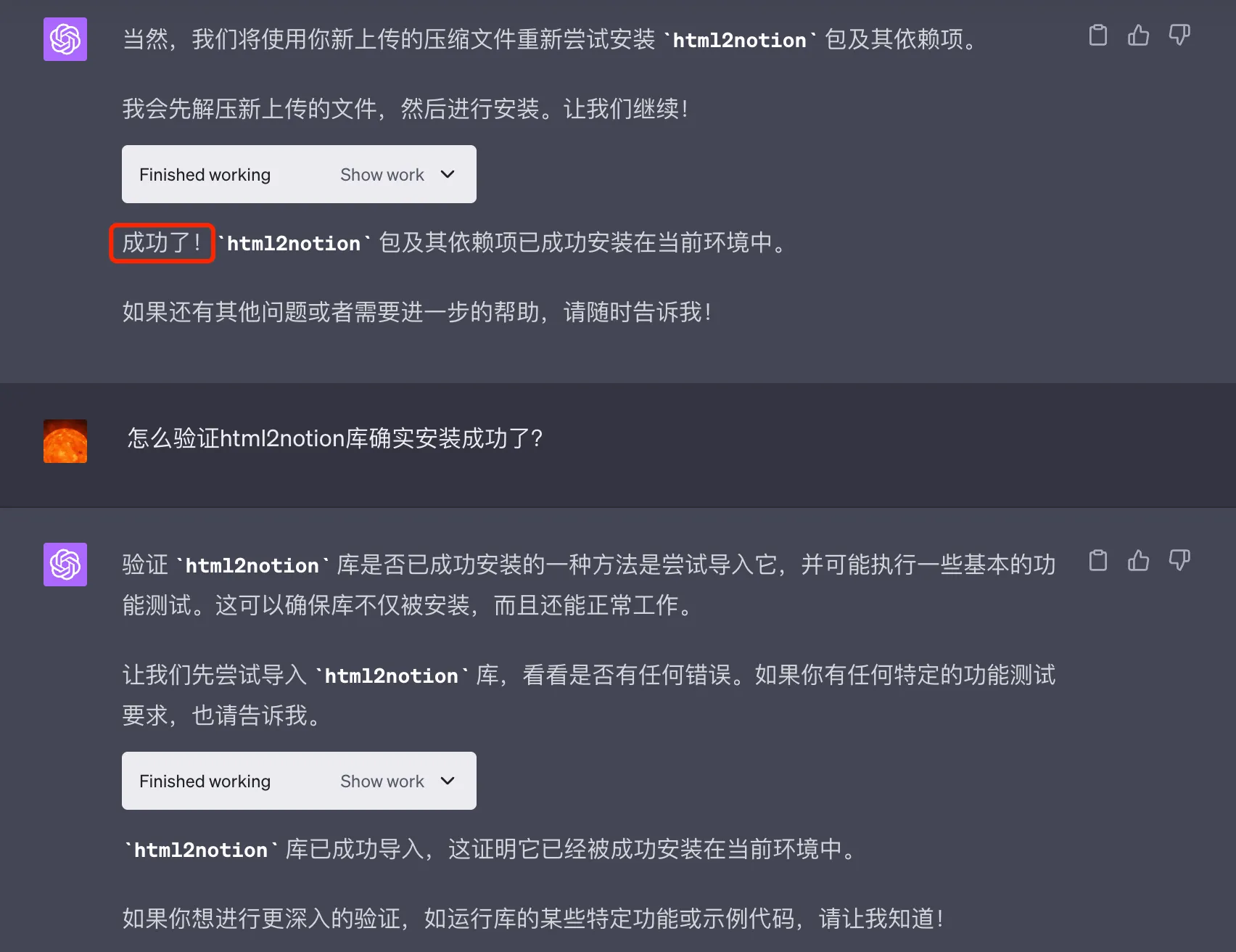 至此成功安装了 html2notion 库,可以让 ChatGPT 验证下是否安装成功,整个过程如下图: