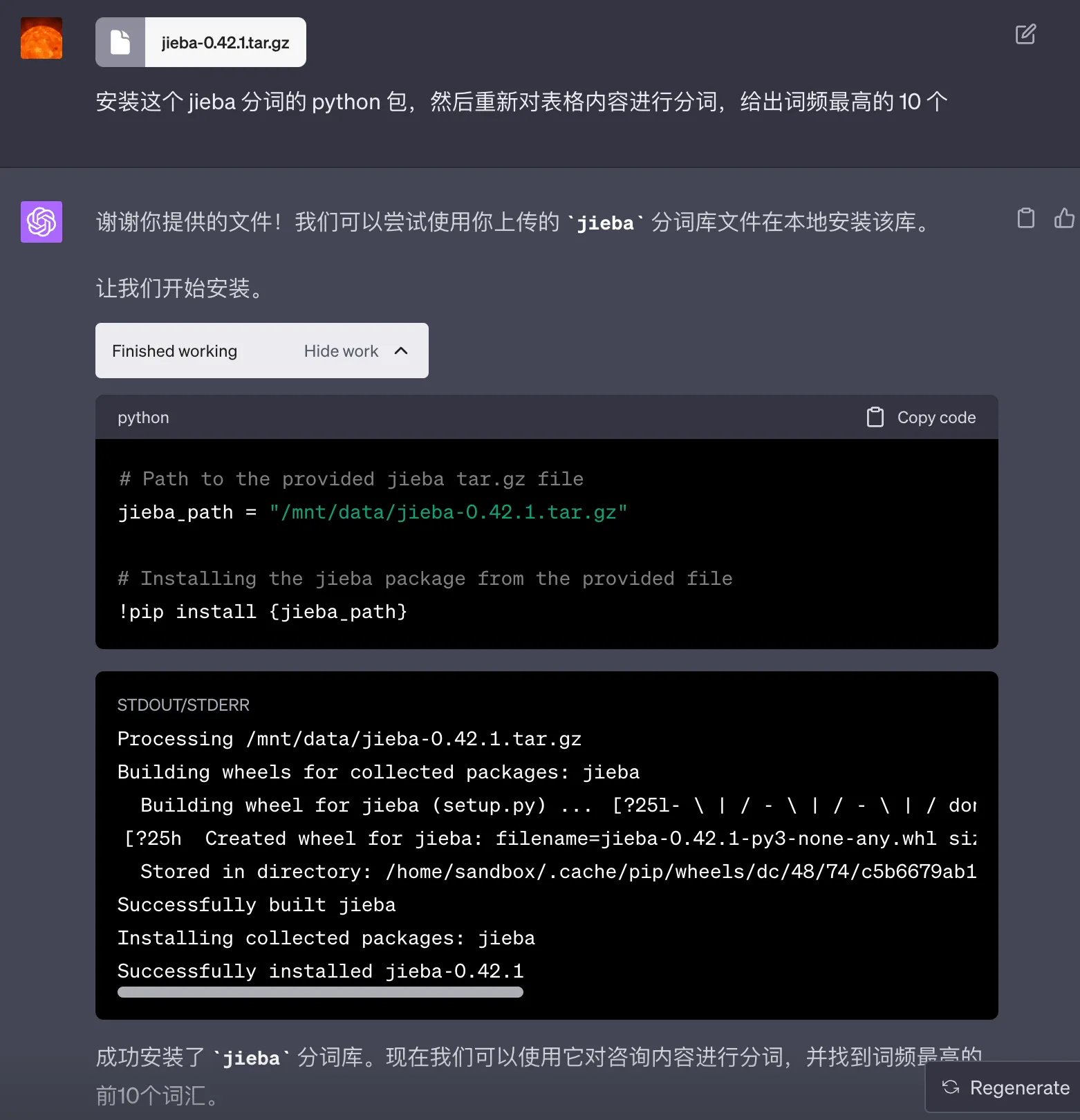 ChatGPT Code Interpreter 安装 Python 库 jieba