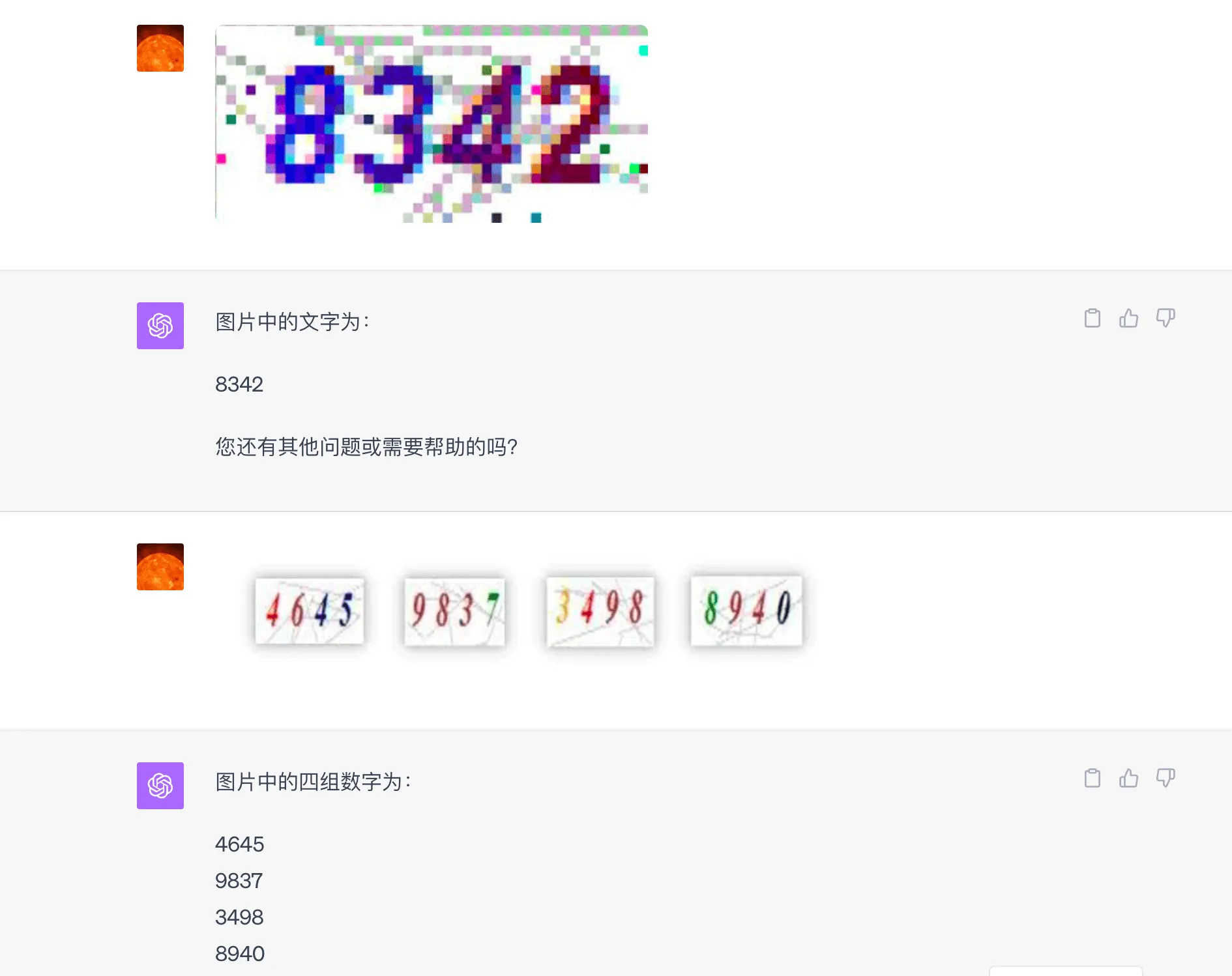 先拿最简单的数字验证码试水,这些验证码其实早就已经被神经网络搞定,不用什么大模型都能轻松识别。不过还是拿出来试试水,看看ChatGPT 表现咋样。