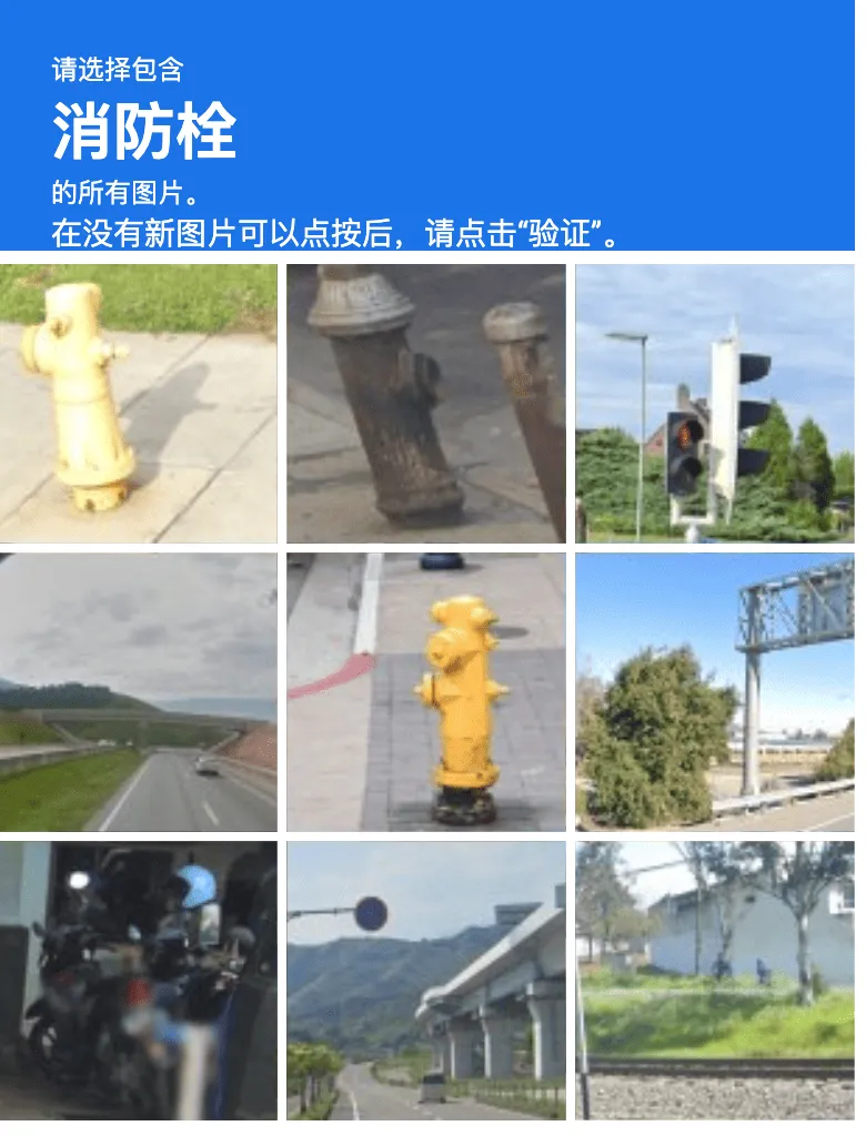 还是和上次一样的答案,认为第二行第三张是黄色消防栓。不过你要提示它错了的话,它又能很快纠正说第二行第二张才是。换了几个验证码图片,识别的正确率不是很高。