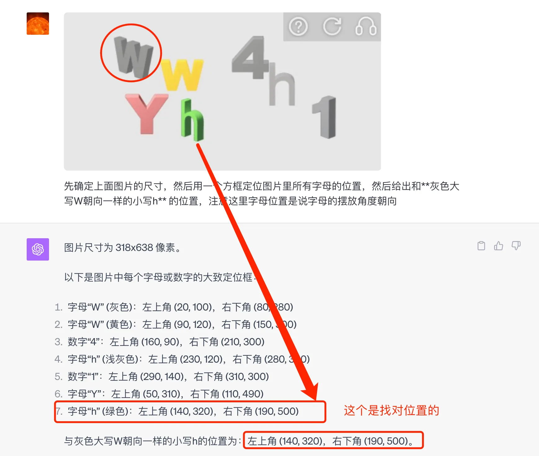 这个验证码需要找到“和绿色大写E朝向一样的大写W”,直接拿这个来问 ChatGPT 的话,得到的并不正确(和绿色大写E朝向一样的大写W位于图片的中间右侧),虽然看起来找到了 W,但是方向不对。继续用 Object Localization 的方法,经过几轮沟通,发现了一个还算可以的提示词:
