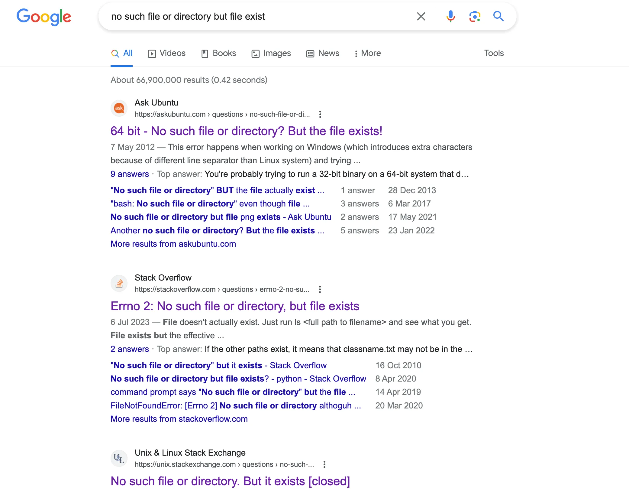 在有 ChatGPT 之前,遇见解决不了的问题,就先去搜索引擎看看,搜索 no such file or directory but file exist,有不少结果:
