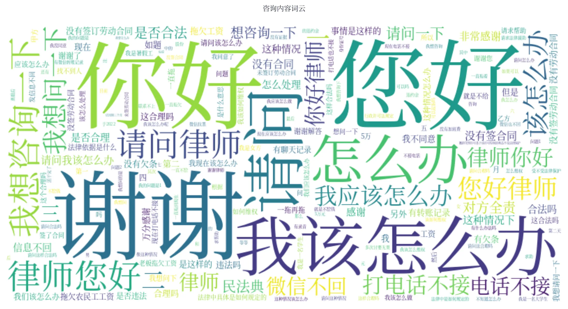 这个和数据集还是有很大关系的,在法律咨询的数据集中有很多类似内容,导致模型学习到了错误的特征。有些关键词在咨询中出现频次比较高,导致只要有这些关键词的内容,模型就会偏向于认为是法律咨询。比如只输入 “借钱“,”我想咨询下“,模型都会判定为法律咨询。为了看到训练集中法律咨询文本的一些关键词分布,用这部分数据生成了词云,如下图: