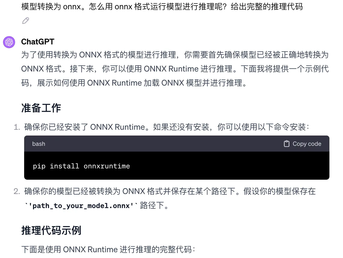 模型的训练和部署过程,放在以前可能会耗费我大量时间。因为需要查各种资料和文档,然后才能写训练代码,写部署服务,写 docker 配置。但是现在有了 ChatGPT,整个过程没费太多时间。本文的大部分代码都是在 ChatGPT 帮助下完成的,一些配置和细节,也是 ChatGPT 帮我完成的。比如下图中的 onnx 模型推理部分: