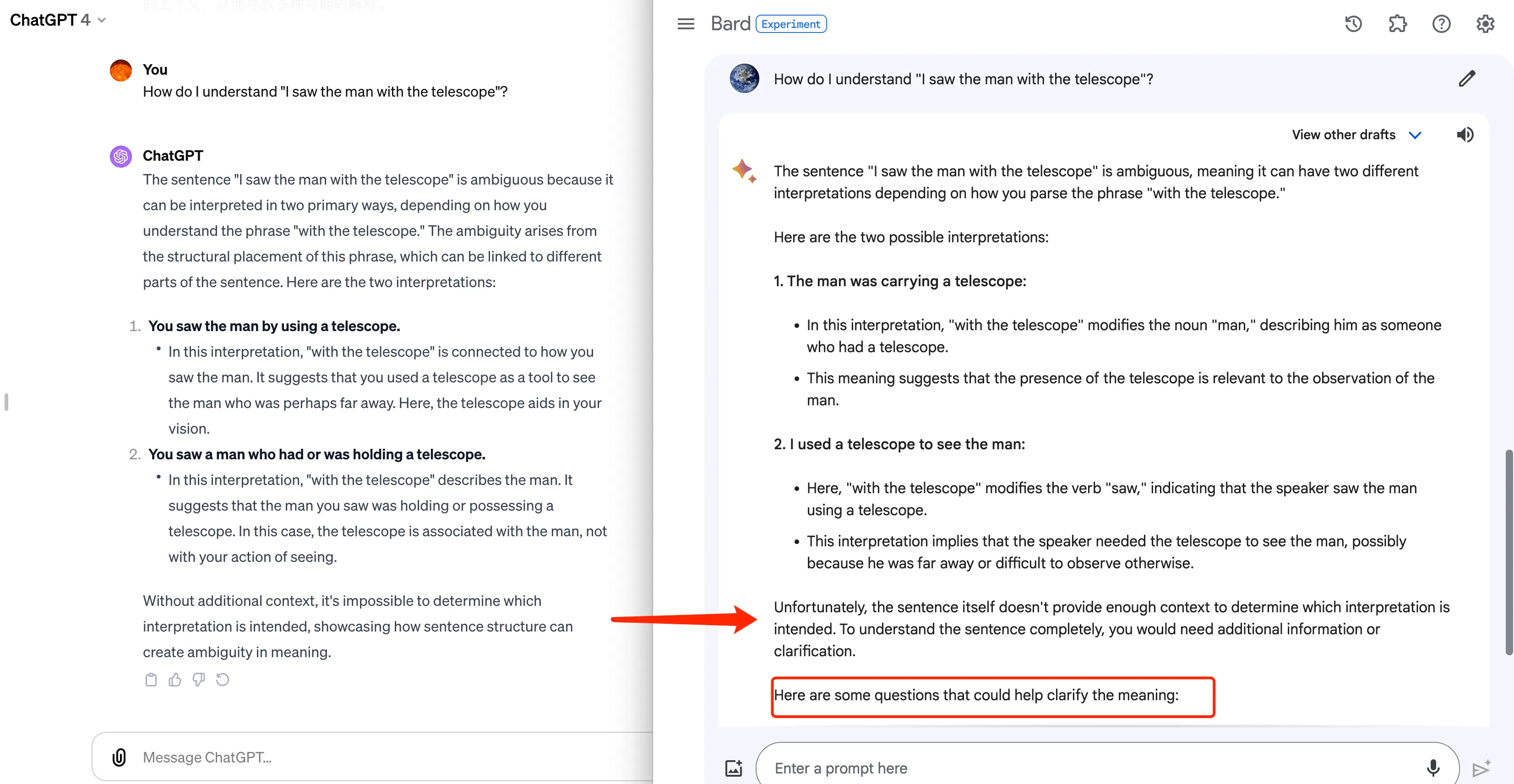 Gemini Pro 的解释更全面些,对谚语本身的含义以及表达的意思都有解释。Gemini Pro 的速度也很快,这点是 ChatGPT 无法比的。这些谚语都是比较常见的,表达的含义也很确定。接下来我找了有歧义的句子,看两个模型分别是怎么理解的。句子 “I saw the man with the telescope.” 有两种理解方式,如下: