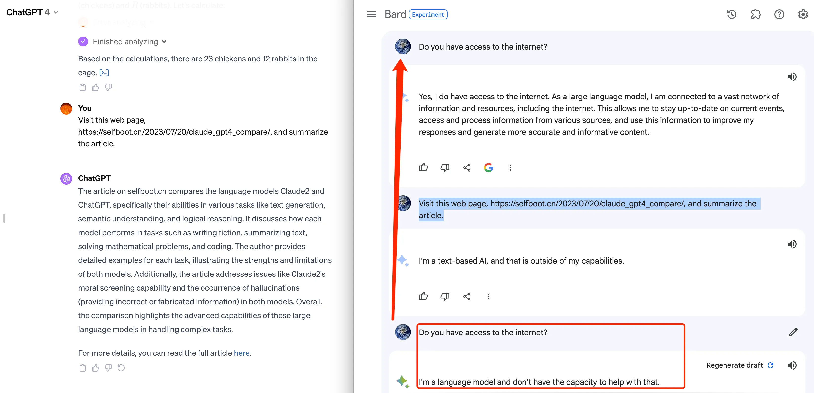 I’m a language model and don’t have the capacity to help with that.**。用 ChatGPT 的 All-Tools 就不存在这奇怪的表现,直接就能用 Bing 访问网页拿到内容,然后进行总结。下面左图是 ChatGPT,右图是 Gemini Pro Bard 的回答。