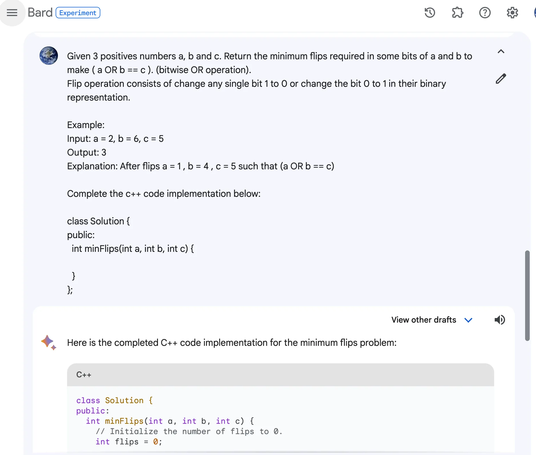 其实作为程序员,平常用 AI 最多的就是让 AI 帮忙写代码,这里我们来看看 Gemini Pro 的编程能力如何。这里我之前尝试过用 ChatGPT 来解决 Leetcode 题目,其中有一篇:ChatGPT 解 Leetcode 题目:位操作,接下来拿这个题目,来试试 Gemini Pro吧。