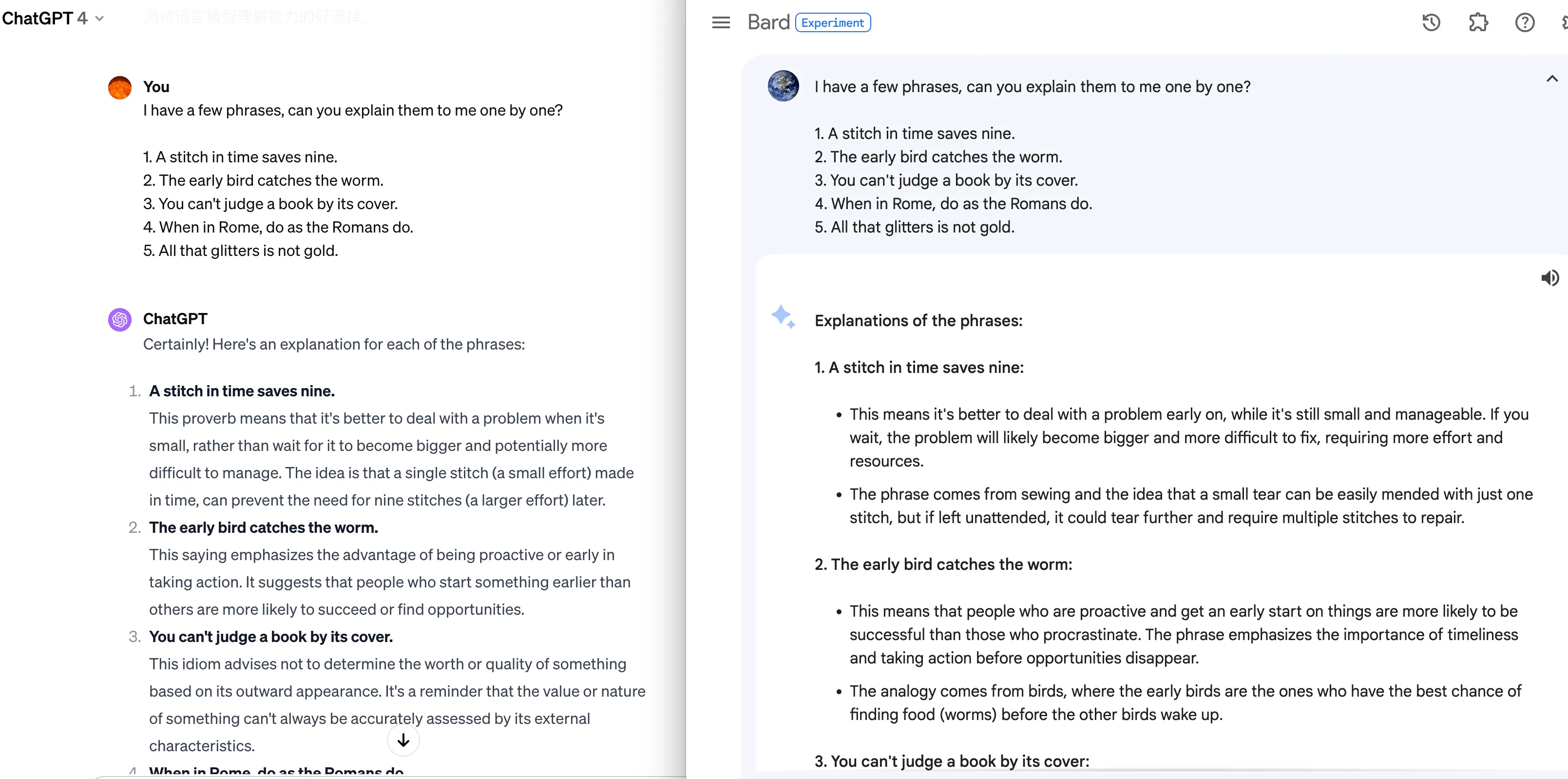 首先是阅读理解能力,我找了几个比较著名的英语谚语,来看看 Gemini Pro 的理解是否正确。提示词如下: