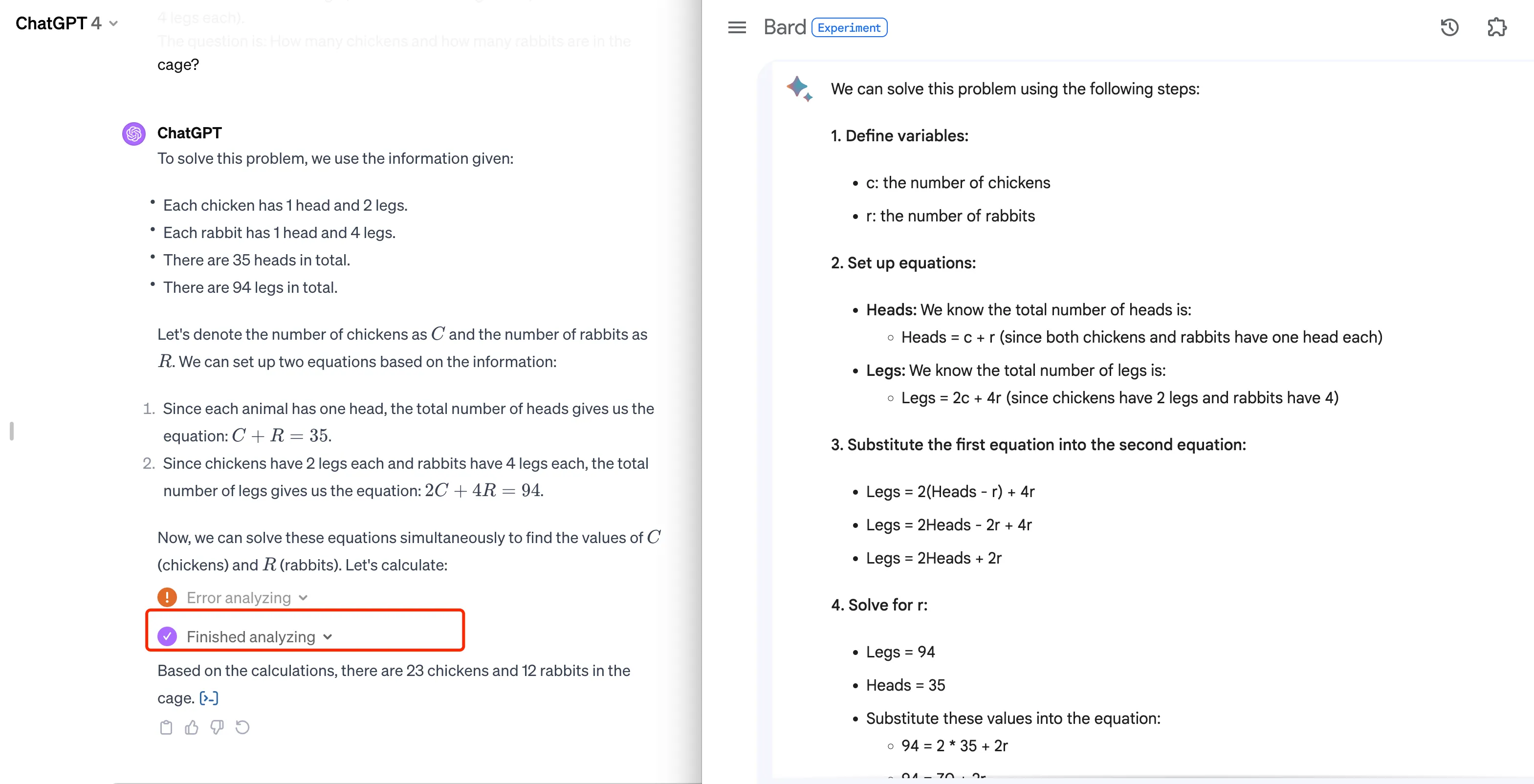 对目前的生成式 AI 来说,数学问题是个难点,和人类比,AI 在数学领域还是一个小学生。我们拿经典的鸡兔同笼问题来考考 Gemini Pro。提示词如下: