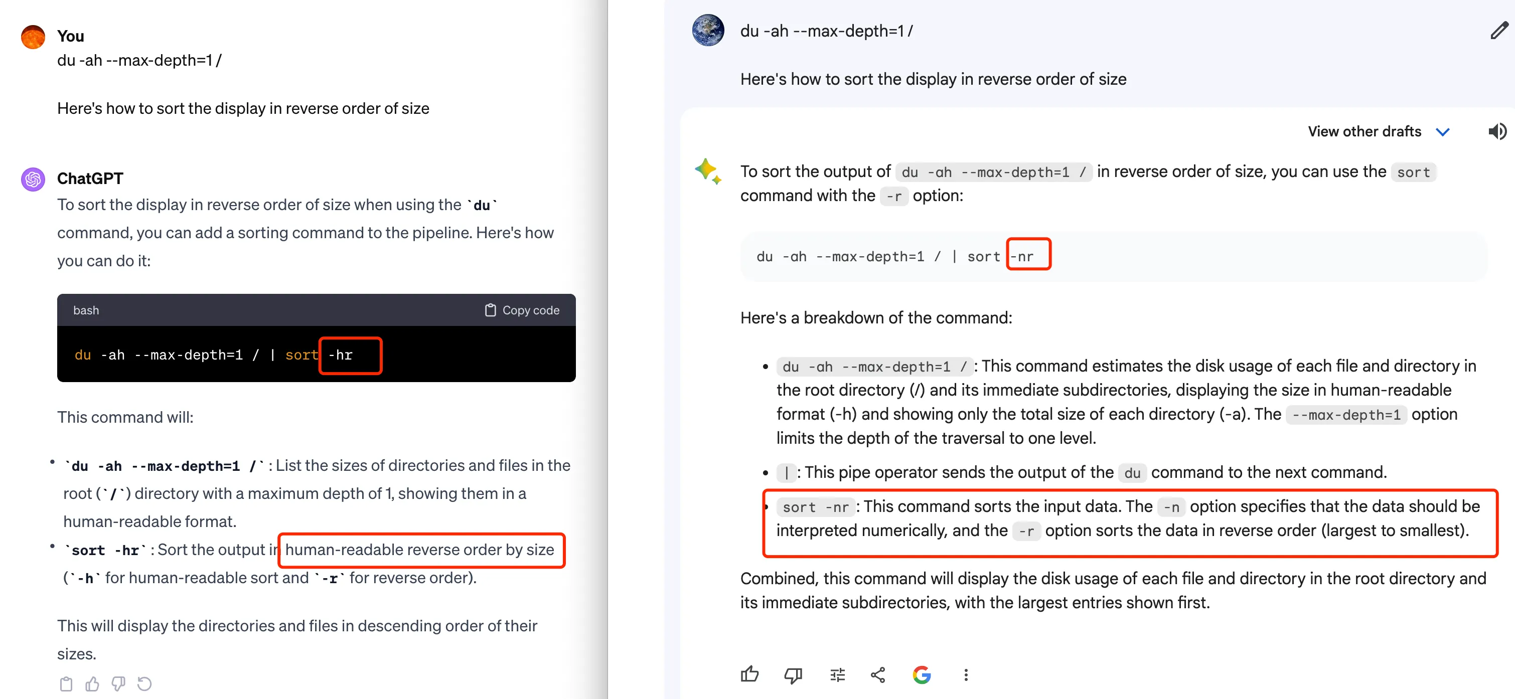 ChatGPT 的回答很智能,根据 du 中输出 -h,然后告诉正确的 sort 参数用法。Gemini Pro 的回答就差劲了一些,没有考虑到这里的 -h 参数。