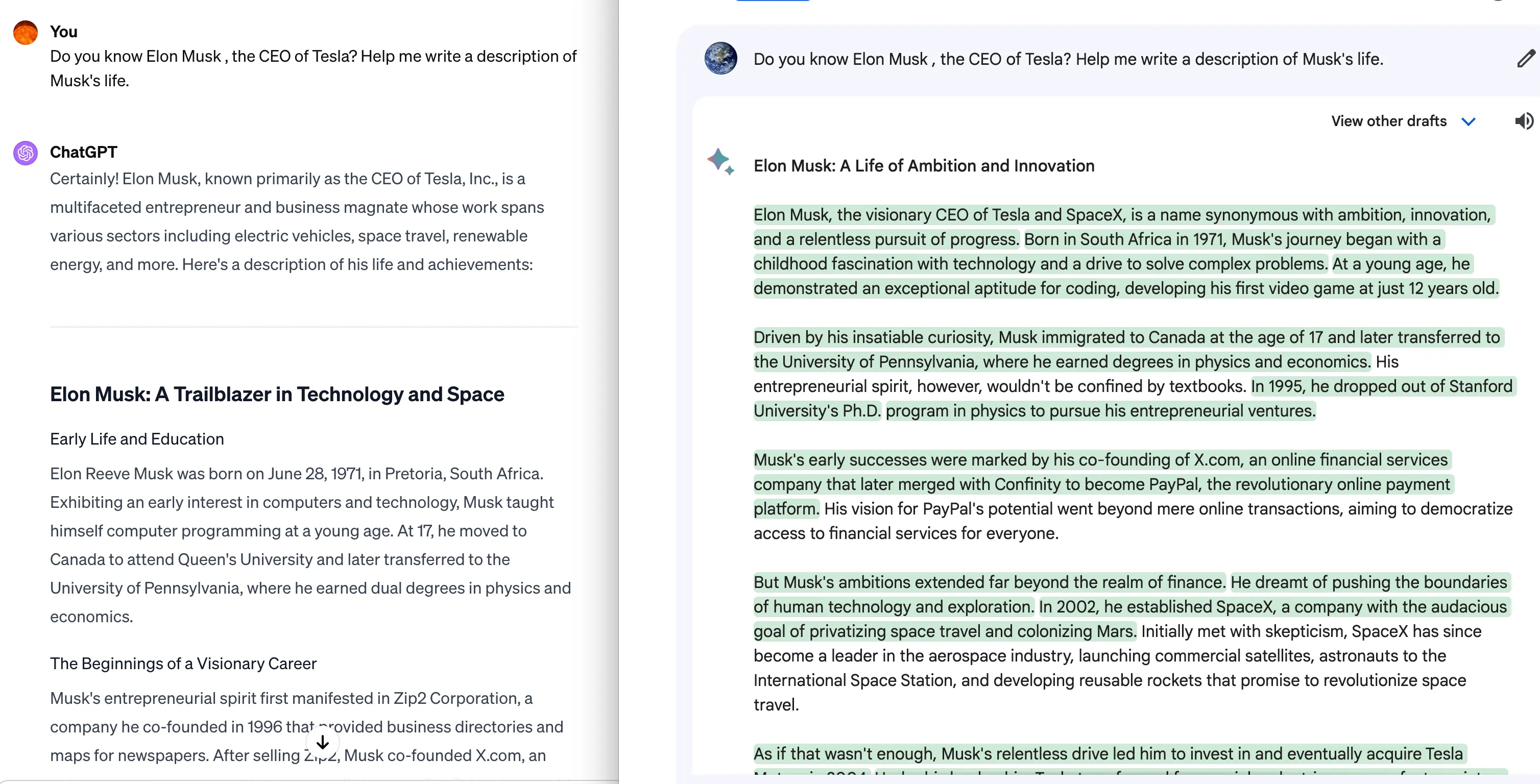 想让 AI 扮演一个传记作家,然后写一下马斯克的生平。Gemini Pro 会追问,让我提供更多细节,比如着重写哪部分,而 ChatGPT 则从出生,教育,创业投资经历,Space X 和火星梦,特斯拉等重点内容,写了一个很不错的介绍。接着我改了下提示词: