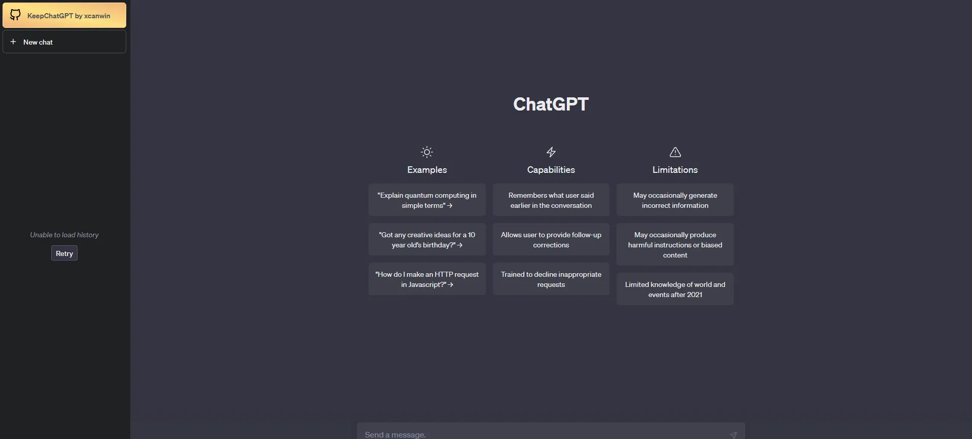 对于 IP 问题,最好的方法是用一个 OpenAI 支持国家和地区的纯净 IP,然后最好是独自用,这样不会触发频率限制。如果很多人用,因为 OpenAI 对单个 IP 的访问频率有限制,可能会导致返回 429 错误。这时候打开站点可能会像下图一样,加载不出来历史记录,并且会话也没法用。
