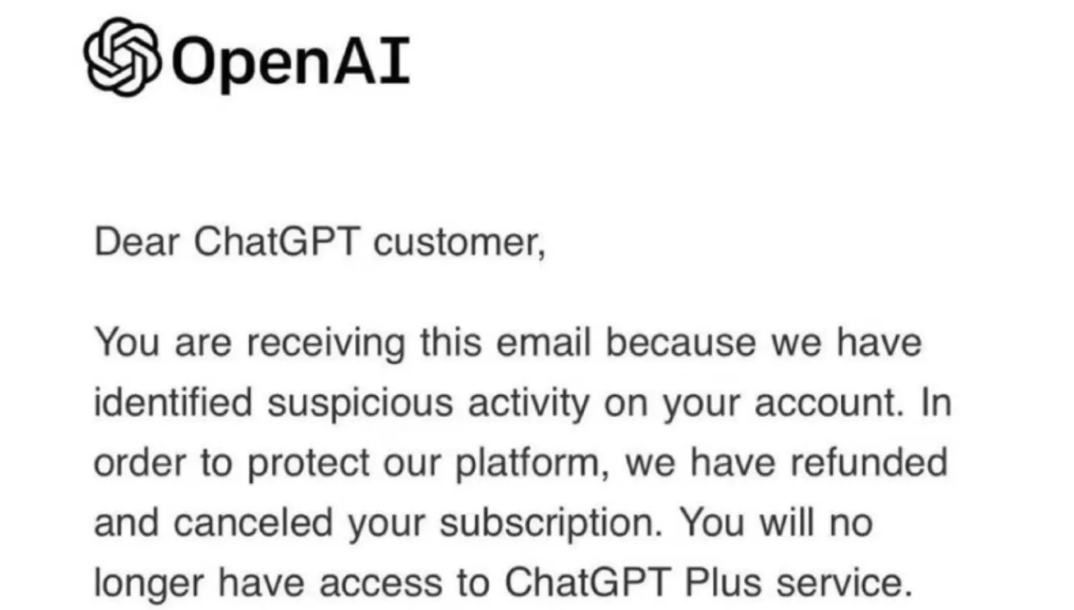 除了对 IP 有拦截,OpenAI 还有一套内部的非公开的策略,来对账户进行安全检测。如果你的账户触发了他们的风控规则,那么就会被永久封号。一般如果你的账户登录不上去,查看下邮件,如果有收到 OpenAI 的类似邮件,说明账户就被封了。