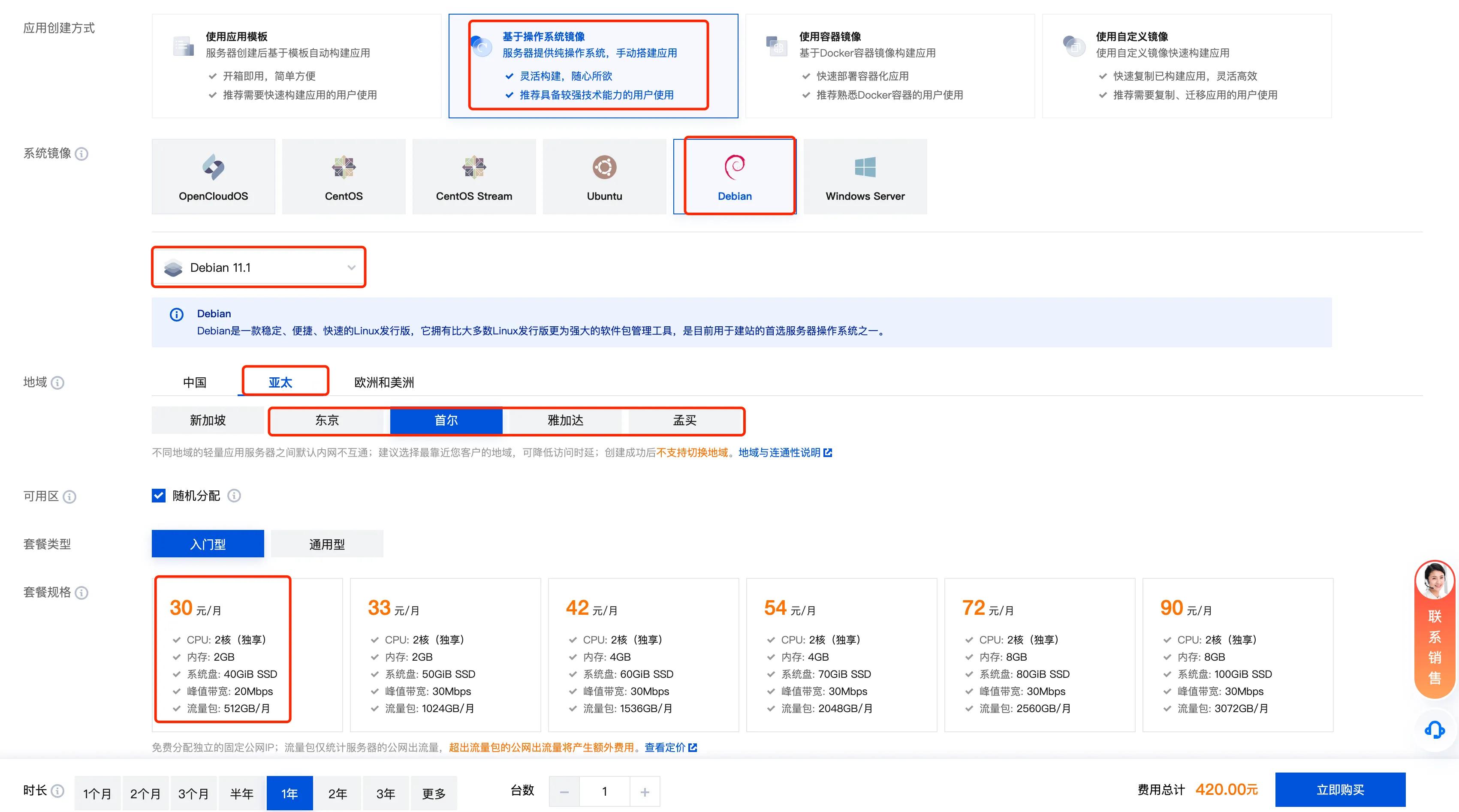 首先自己得有个云服务器,可以用腾讯云,阿里云,Google Cloud 等,国内的相对便宜,但用的人也多,会有概率遇到 429。Google 云贵很多,支付也得外币信用卡,好处是速度快,用的人不多,没遇见过 429 问题。本文以腾讯云为例,选择轻量应用服务器最便宜的配置即可,选择亚太地区(首尔,日本,雅加达都可以),入门级最便宜配置即可满足需求,一年大概 420 左右。如果有双十一优惠,这里价钱会非常便宜。