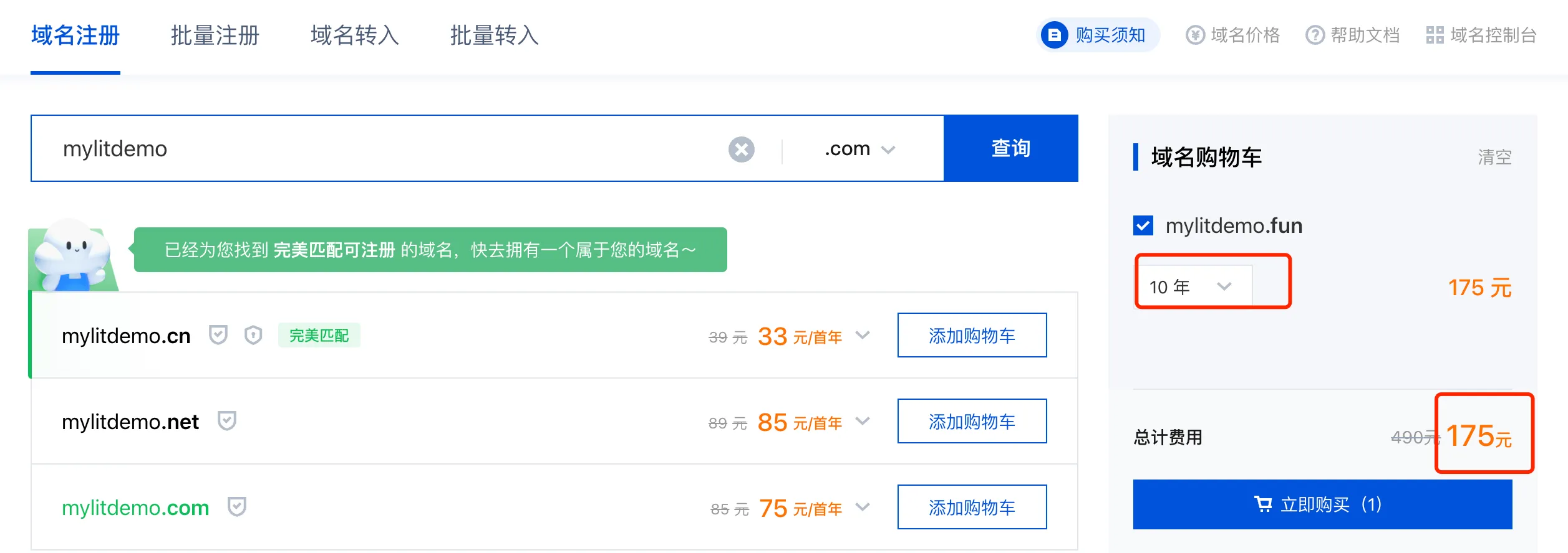 如果自己没有域名,需要先买一个,可以在腾讯云上面购买。因为我们的服务器在国外,所以域名不用备案,买了直接就能用的。这里可以选择一个不常见的域名,再配合小众后缀,然后就很便宜了。比如我随便找了一个域名mylitdemo,然后配合 .fun 后缀,10 年才 175 块钱,非常便宜(越是简短、好记的域名越贵,可以选一些无意义,很长的便宜域名)。
