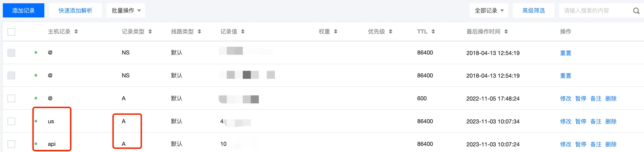 然后需要在腾讯云的 DNSPod 里面添加一条域名解析 A 记录,到购买的服务器的公网 IP 上。这里我们不一定要二级域名,可以用三级子域名,比如 us.mylitdemo.fun 来解析到服务器的公网 IP。然后如果有多台服务器,可以为每台分配一个子域名,如下图中的 us 和 api 两个子域名: