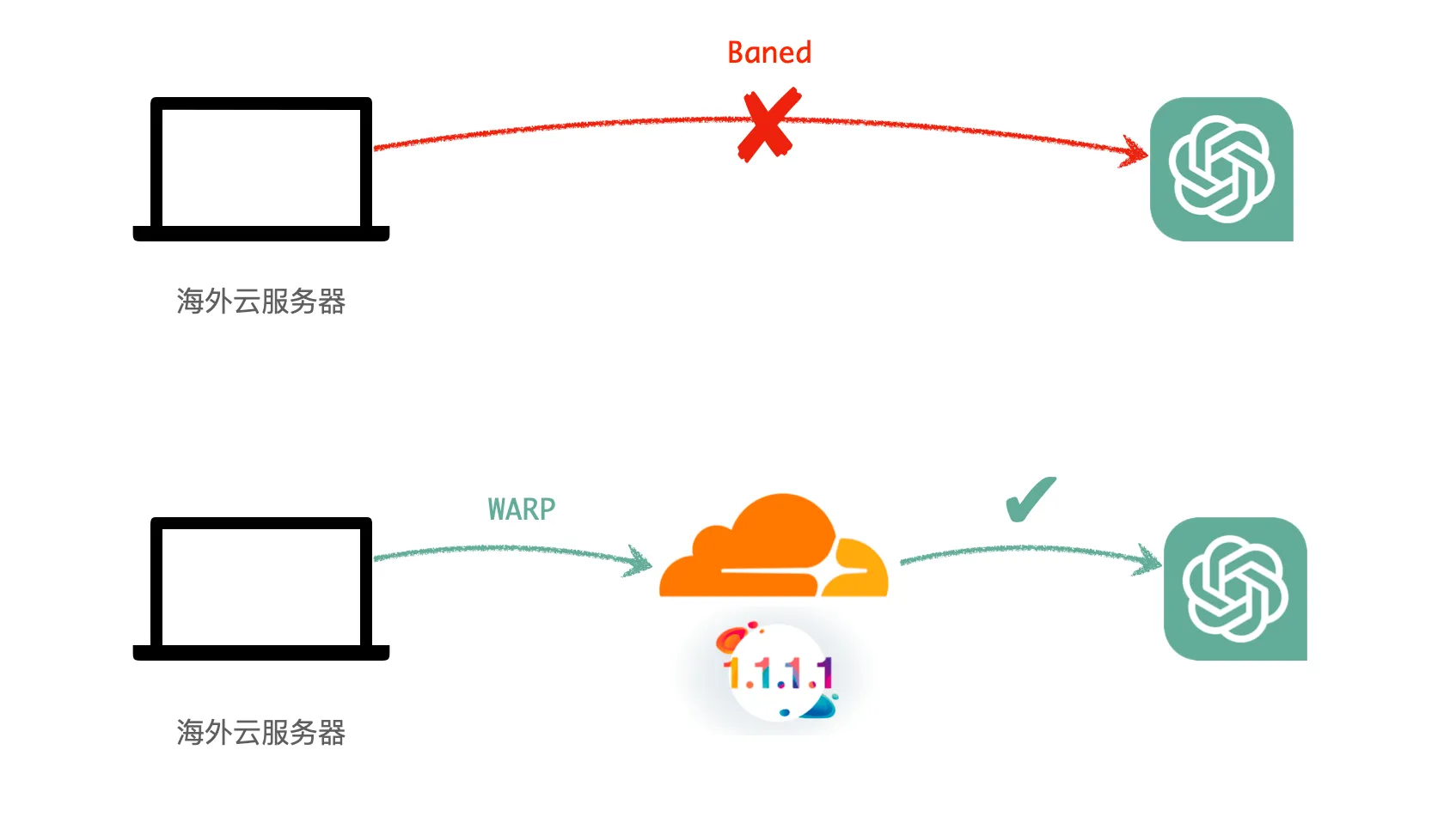 上面是普通情况,海外服务器直接请求 ChatGPT 会被拦截,但是我们可以经过 Cloudflare 的 Warp 中转,这样 OpenAI 看到的 IP 就是 Cloudflare 自己的,并不是我们的服务器 IP,算骗过了 OpenAI。这里 Cloudflare 是国外很大一家 CDN 服务商,OpenAI 的 IP 拦截其实也用了 Cloudflare 自家的能力,所以这里对 Cloudflare 来源的请求都是放过的。