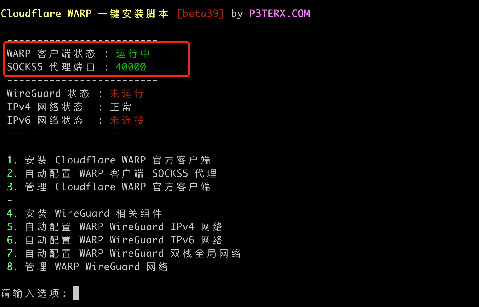 在服务器执行上面命令后,输入 2,然后就会自动安装配置 Warp 客户端和 socks5 代理。后面可以继续运行这个命令,就能看到当前 Warp 的状态,如下图说明 Socks5 代理已经启动了。