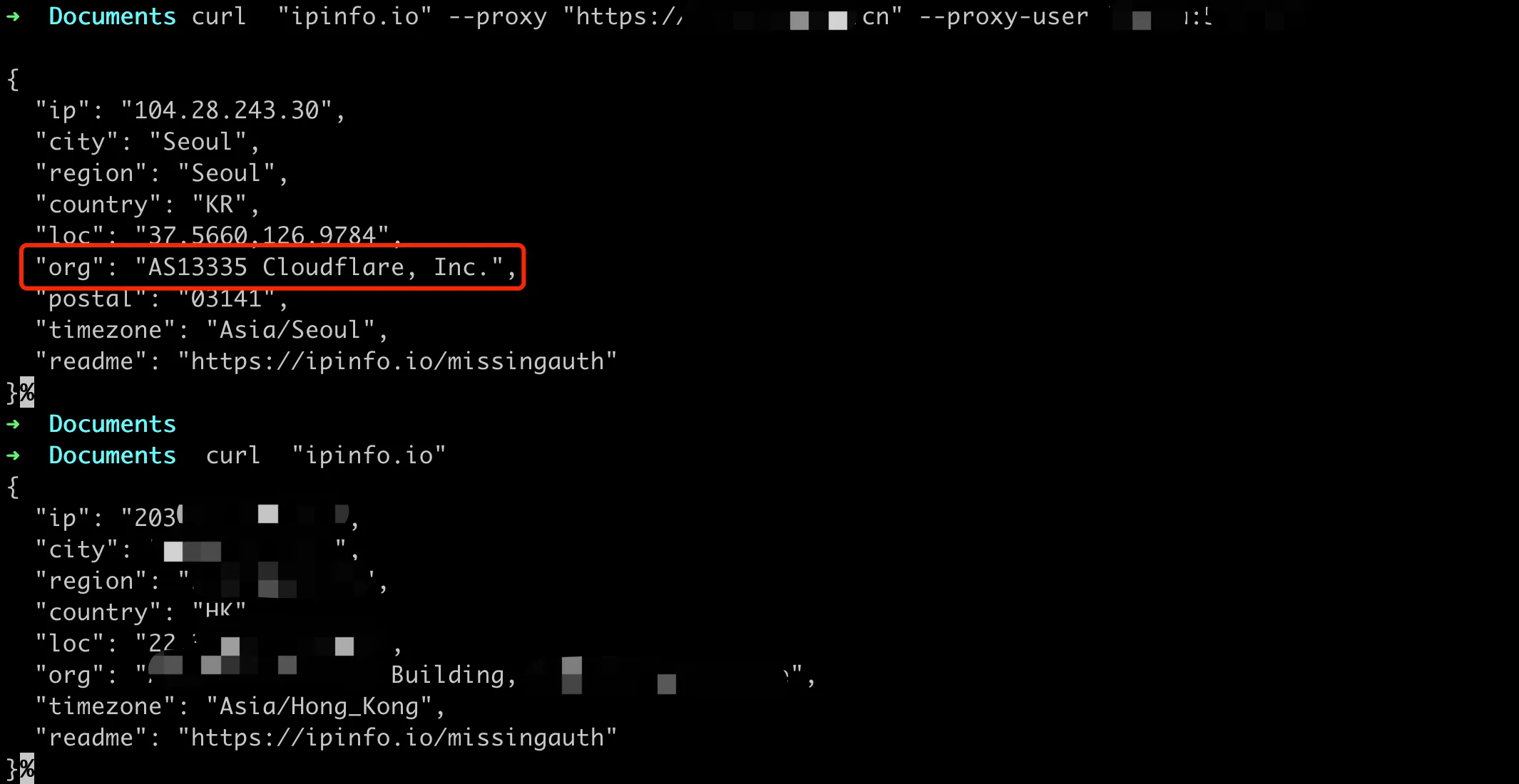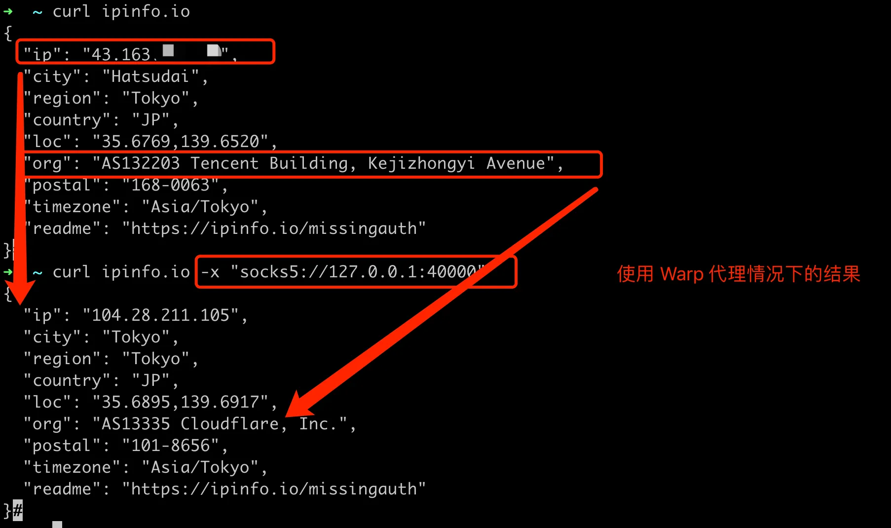 启动成功后,还是要验证下的,可以用 curl 命令向 ipinfo.io 发起一个 http GET 请求,然后查看在直接访问和使用 Warp 代理情况下,对方看到的 IP 地址是否符合预期。从下图可以看到,在使用了 Warp 的代理后,对方看到的 IP 地址是 Cloudflare 的,而不是我们自己服务器 IP。