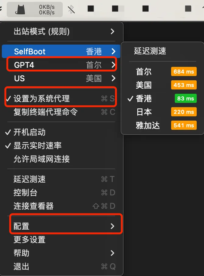 经过上面配置后,如果还是不能正常访问 ChatGPT,可以通过下面几个步骤来排查。首先查看代理服务器能否正常连接,可以先用 前面的 curl 来确保代理连接的上,然后在 Clash 中用延迟测速,看速度是否正常。一般 500ms 以内的延迟,都是可以接受的。如果速度正常,并且勾选了设置为系统代理,正常就不会有问题的。