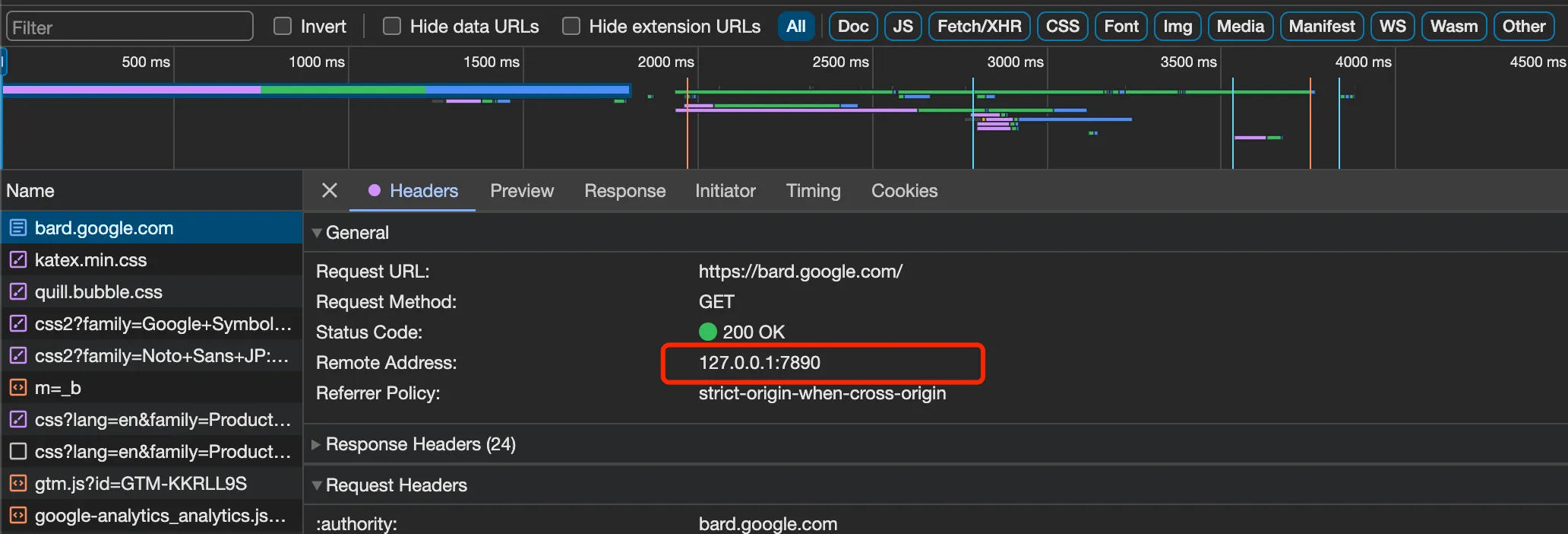 这时候如果浏览器访问 chat.openai.com 还是不行,可以检查浏览器的网络请求有没有经过代理服务的端口。这里 Clash 默认会启动 7890 的本地端口来转发流量,用 chrome 的开发者工具,可以看到是否经过本地的 7890 端口转发。