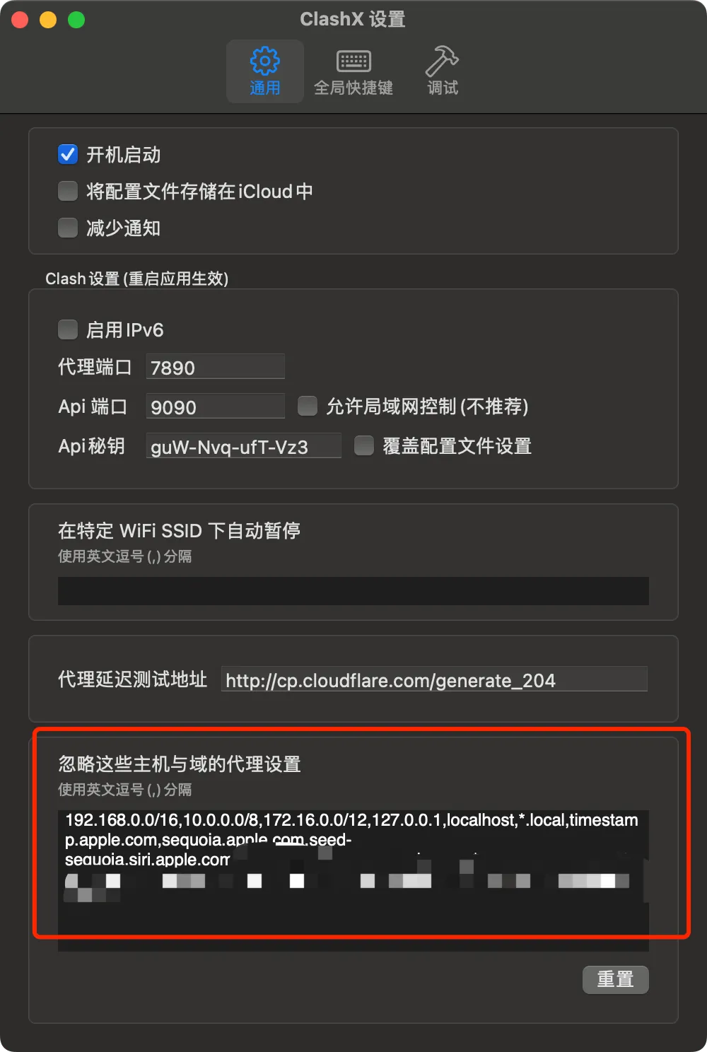 有时候在某些内网中,有些 oa 站点需要用电脑中其他代理软件来访问才行。这时候,可以在 Clash 中配置好这些特殊站点,让它不经过 Clash 代理,还是按照原来的访问方式。可以在更多设置中的最下面添加要跳过的域名,如下图: