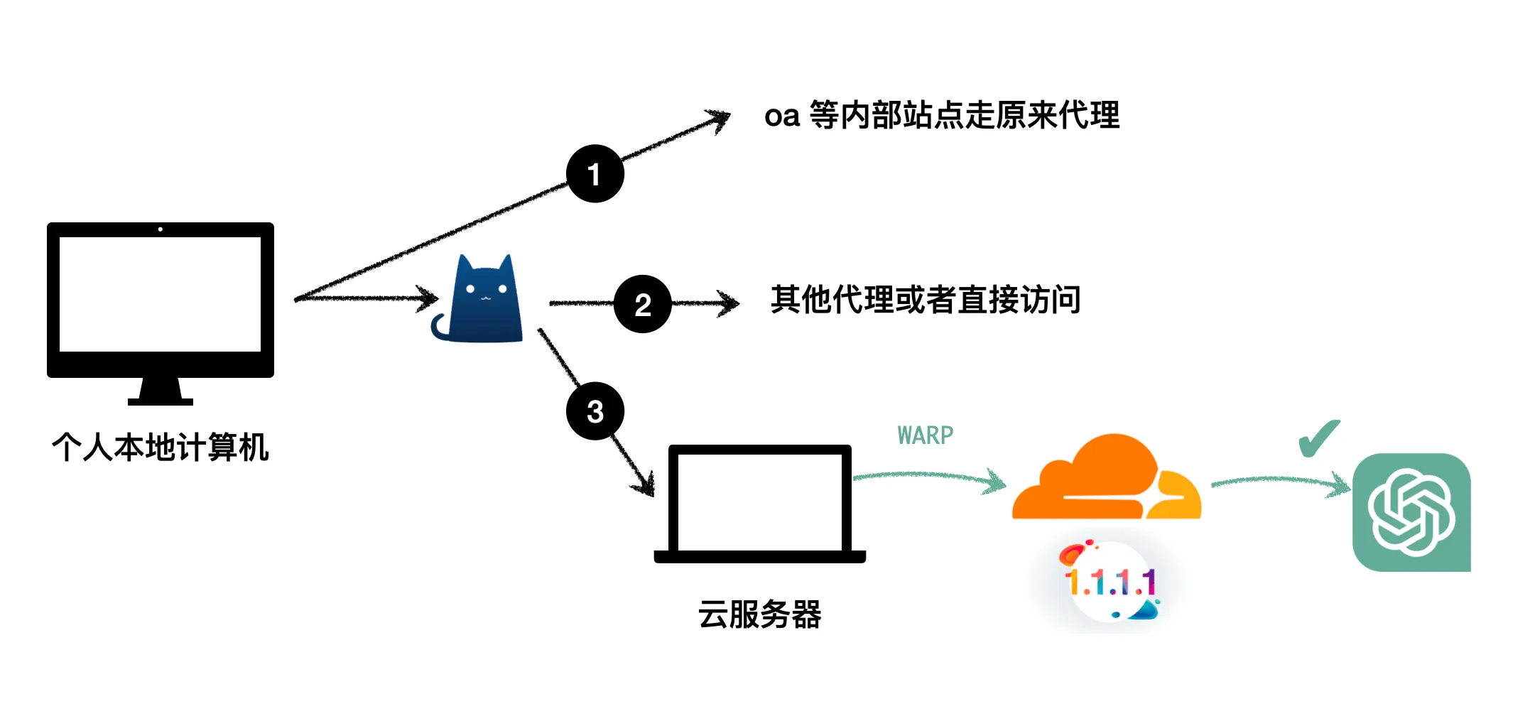 - 访问 chat.openai.com,经过代理后,再把请求转发云服务器,最后通过 warp 出口 IP 访问。