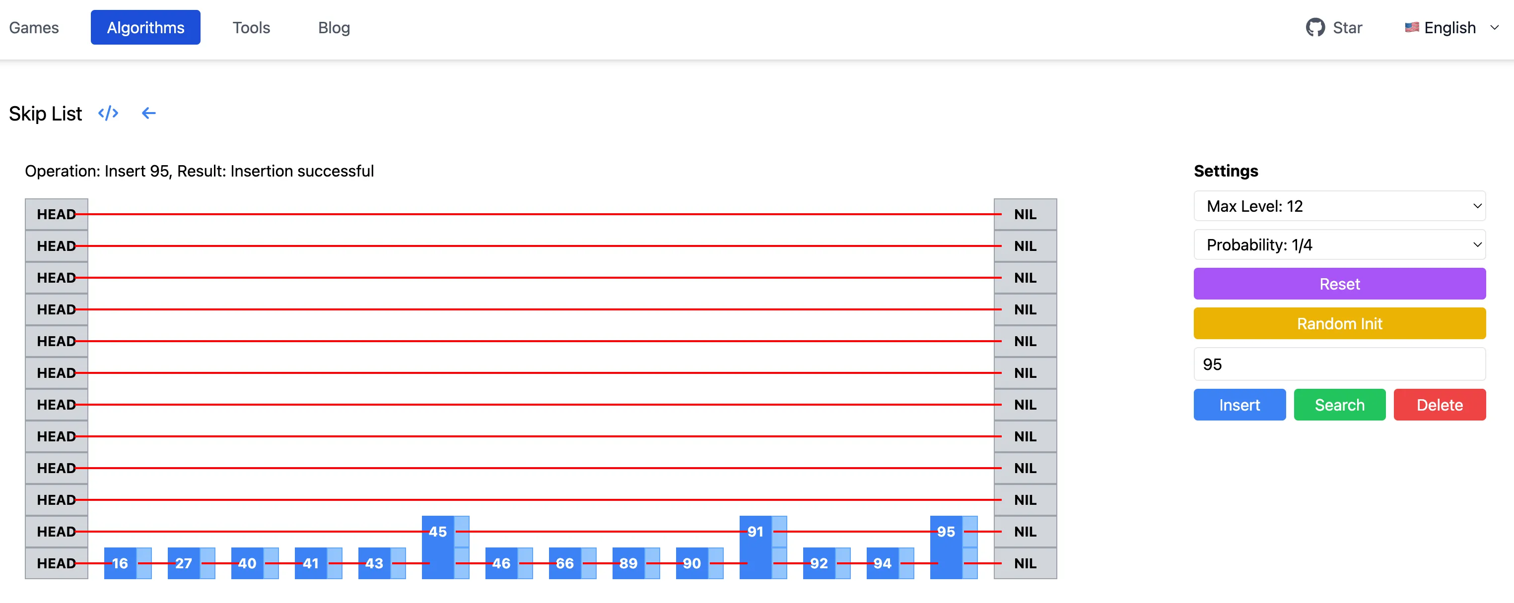 为了直观看看跳表构建的过程,我用 Claude3.5 做了一个跳表可视化页面。可以指定跳表的最大层高,以及调整递增层高的概率,然后可以随机初始化跳表,或者插入、删除、查找节点,观察跳表结构的变化。