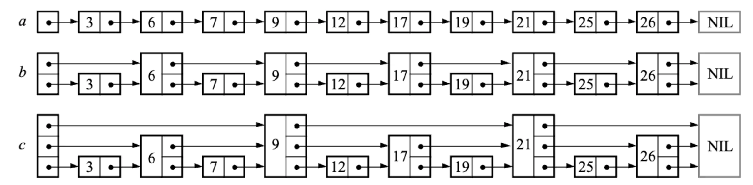 在开始跳表的原理之前,我们先回顾下有序链表的搜索。如果我们要查找一个有序链表,那么只能从头扫描,这样复杂度是 。但这样就没有利用到有序的特性,如果是有序数组,通过二分查找,可以将复杂度降低到 。有序链表和有序数组的差别就在于无法通过下标快速访问中间元素,只能通过指针遍历。