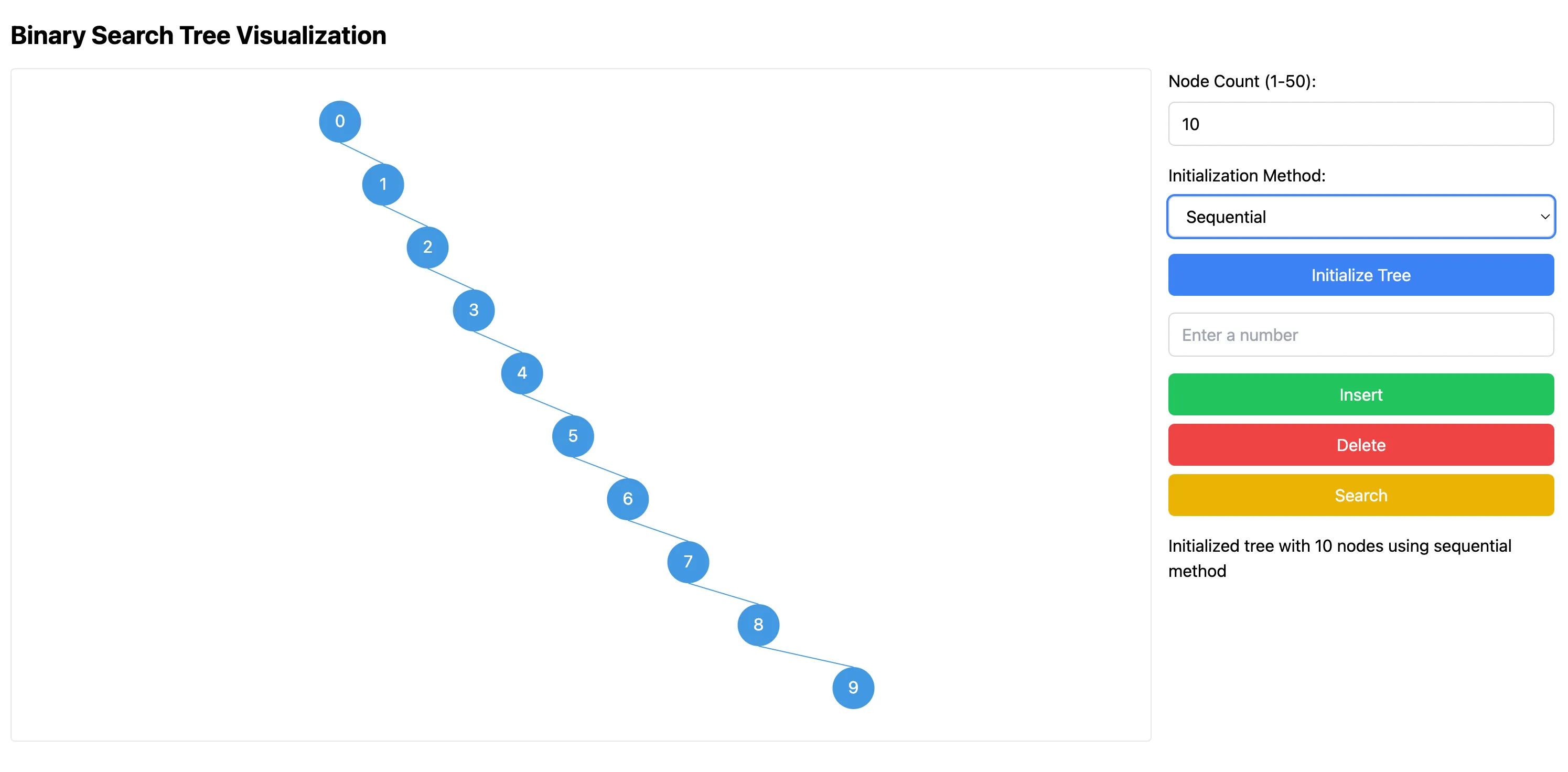 二叉搜索树的平均时间复杂度是 ,但如果二叉搜索树中的元素是按照顺序插入的,那么这棵树可能会退化成一个链表,使得操作的时间复杂度从 退化为 。比如下图就是按照顺序插入 10 个元素后,二叉搜索树的结构: